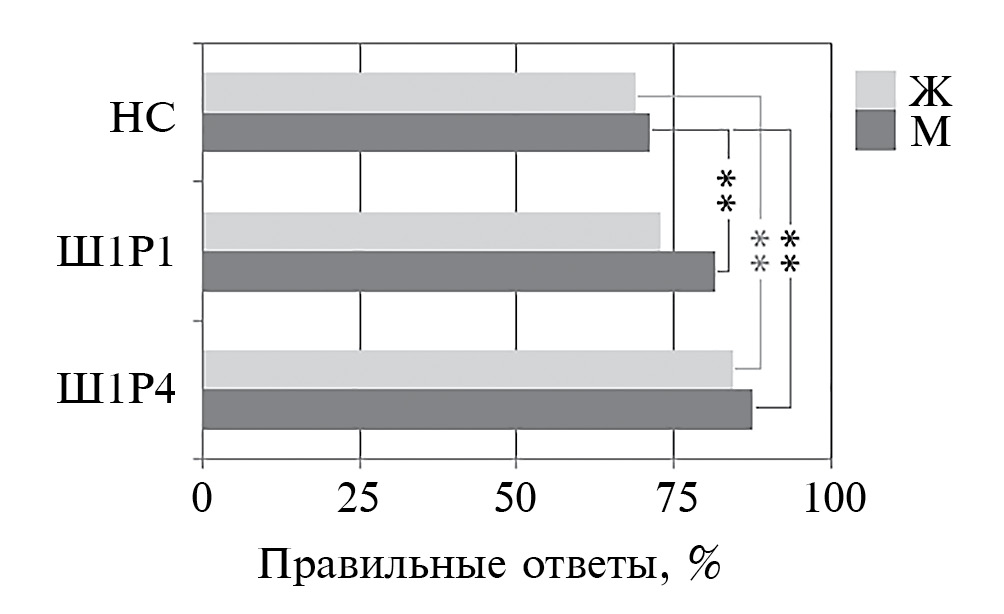 Рис. 2. Показатели правильных ответов при восприятии одного набора речевых стимулов и шума многоголосия в разных условиях. Непространственная сцена (НС): определение пола диктора по голосу при стимуляции через головные телефоны. Пространственные сцены: обнаружение речевого сигнала в свободном звуковом поле при локализации источников речи и шума на расстоянии 1 м от слушателя (Ш1Р1), при их разнесении по удаленности от слушателя – источник шума на 1 м, источник речи на 4 м (Ш1Р4). ** – достоверность различий p < 0.01 (критерий Манна–Уитни)