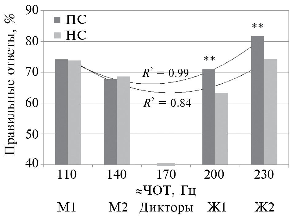 Рис. 3. Распределения правильных ответов (%) по ряду дикторов с разными характеристиками голоса (ЧОТ). НС (непространственная сцена) – данные исследованя по определению пола диктора по голосу в шуме многоголосия. ПС (пространственная сцена) – результаты обнаружения речевого сигнала в пространственной сцене при разнесении источников речи и шума (Ш1Р4) и максимальном зашумлении (SNR = –14 дБ). ** – уровень значимости различий при восприятии женских голосов (p < 0.01, критерий Манна–Уитни)