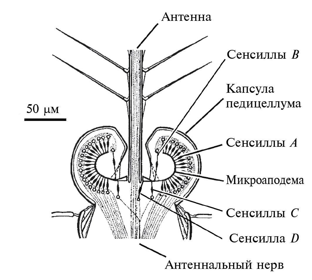 Восприятие звуковых колебаний у комаров осуществляется парными придатками на голове – антеннами (рис. 1) (Johnston, 1855; Roth, 1948; Tischner, Schief, 1955; Belton, 1974). Вызванные звуковыми волнами вибрации жгутика (флагеллума) антенн передаются многочисленным сенсиллам джонстоновых органов (ДО) и затем преобразуются в переменные электрические потенциалы (Tischner, 1953; Belton, 1974). Дистальные сегменты антенн несут пучки волосков, придающие антеннам самцов характерный пушистый вид (рис. 1а). Такое опушение способствует увеличению эффективности антенн в качестве приемников колебаний воздуха. У самок опушение менее выражено (рис. 1б).