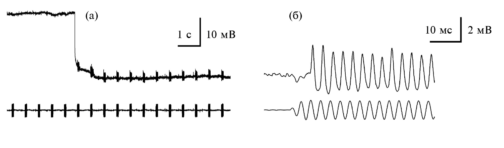 Рис. 3. Активность в аксоне антеннального нерва: момент перехода от внеклеточной регистрации к внутриклеточной (а, верхняя осциллограмма) на фоне действия тональных стимулирующих посылок (а, нижняя осциллограмма). Моменту перехода соответствует отрицательный скачок потенциала. Ответ на акустическую стимуляцию, зарегистрированный в аксоне слухового рецептора при внутриклеточном отведении (б, верхняя осциллограмма). Частота стимула 320 Гц, амплитуда 50 дБ SPVL (б, нижняя осциллограмма)