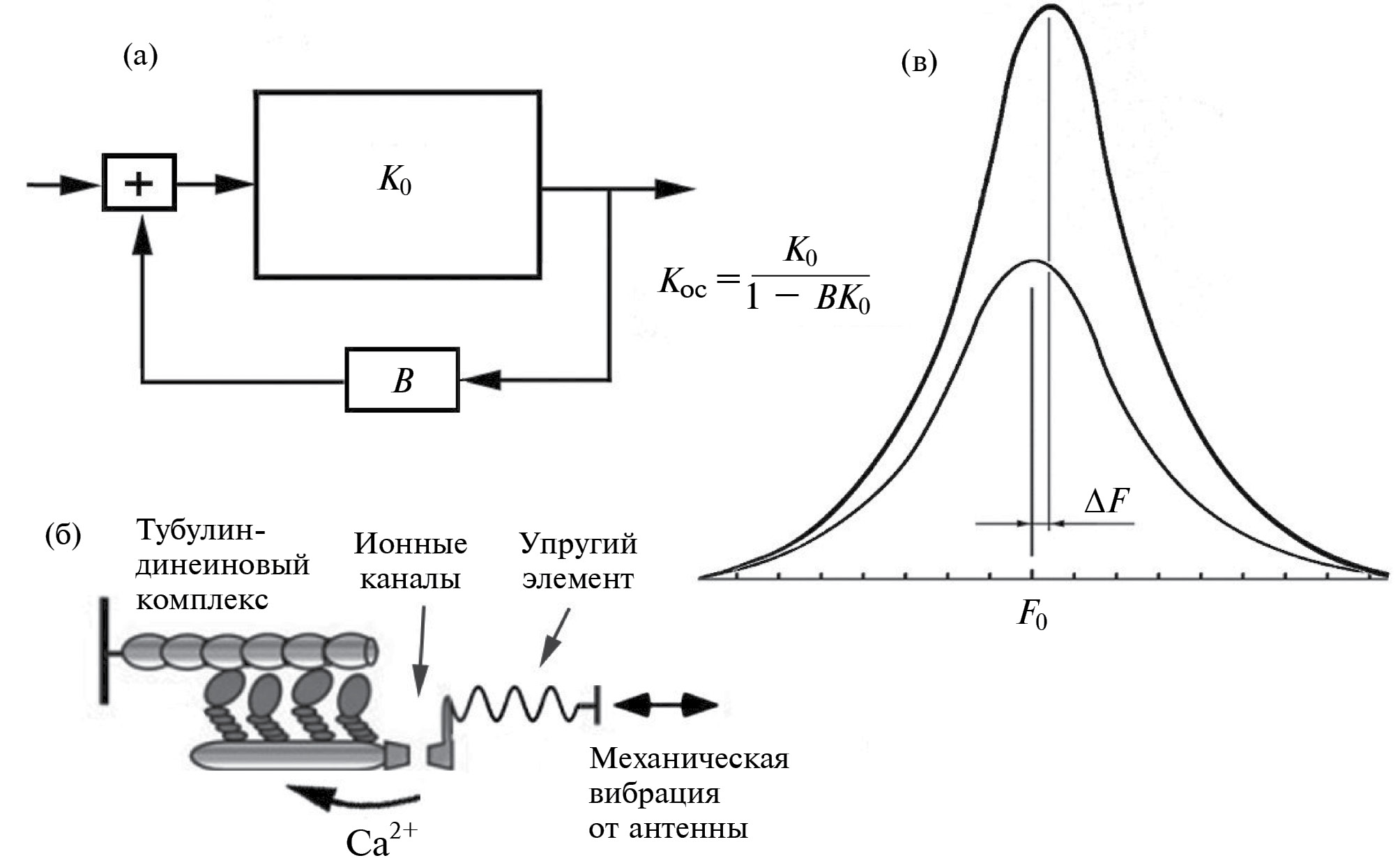 В основе активного механизма усиления, основанного на действии внутренней положительной обратной связи (рис. 5а), предполагается наличие системы механочувствительных ионных каналов, открывающихся под воздействием деформации мембраны, неких двигателей, в своем активном состоянии дополнительно повышающих вероятность активации каналов, и положительной обратной связи между механочувствительной мембраной и двигателем, например, посредством выхода ионов Ca2+ при открывании каналов (рис. 5б). За счет действия положительной обратной связи в системе растет усиление и частотная избирательность (рис. 5в). Усилие от двигателя должно передаваться также ретроградно в сторону антенны и вызывать ее механическую вибрацию. Такой эффект, действительно, наблюдается при измерении механических колебаний антенн комаров.