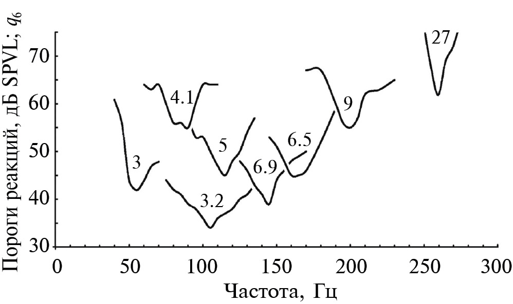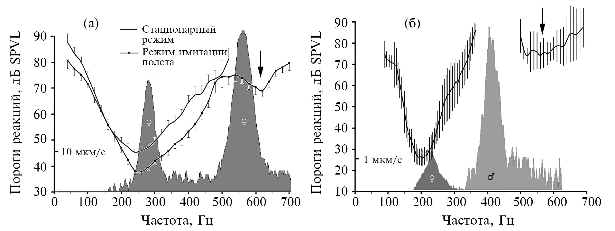 Из анализа суммарных “микрофонных” потенциалов следовало, что комары чувствительны к низкочастотным тонам, по крайней мере, до 20 Гц (пороги порядка 60 дБ SPVL) и нечувствительны к тонам выше 500 Гц (Warren et al., 2009). В поведенческих опытах также было показано, что самцы и самки комаров активно реагируют на звуки полета друг друга, изменяя частоту взмахов крыльев (Gibson, Russell, 2006; Cator et al., 2009; Warren et al., 2009; Pennetier et al., 2010; Aldersley et al., 2016).