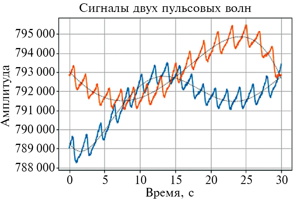 Рис. 1. Графики двух пульсовых волн на 30 с интервале (пунктиром показаны тренды пульсовых волн)