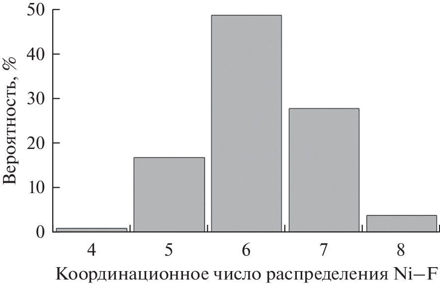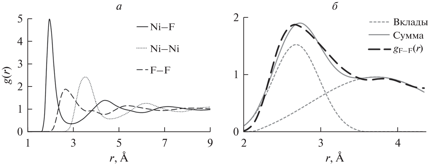 Computer modeling of molten nickel fluoride was carried out using classical molecular dynamics in the temperature range 1750–1900 K. The density of crystalline NiF2 with a relative error of less than 1% verified the parameters of the pair potential obtained in the framework of the quantum-chemical approximation. The calculated radial distribution functions and coordination numbers for the Ni–F pair indicate a distorted octahedral environment of the nickel cation in the melt. In this case, a slight decrease in the nearest cation-anion distance was found in comparison with solid nickel fluoride. It is shown that the curve of the radial distribution function for the fluorine-fluorine pair near the main peak splits into two maxima. The position of the first peak at 2.67 Å is characterized by a coordination number of 5.1 and describes neighboring anions in a distorted octahedron. Whereas, the second maximum can be associated with fluorine anions located along the F–Ni–F line with a peak position at 3.83 Å, which indicates a decrease in a similar distance compared to the crystal. The coefficients of self-diffusion of ions and the viscosity of the NiF2 melt at different temperatures were calculated.