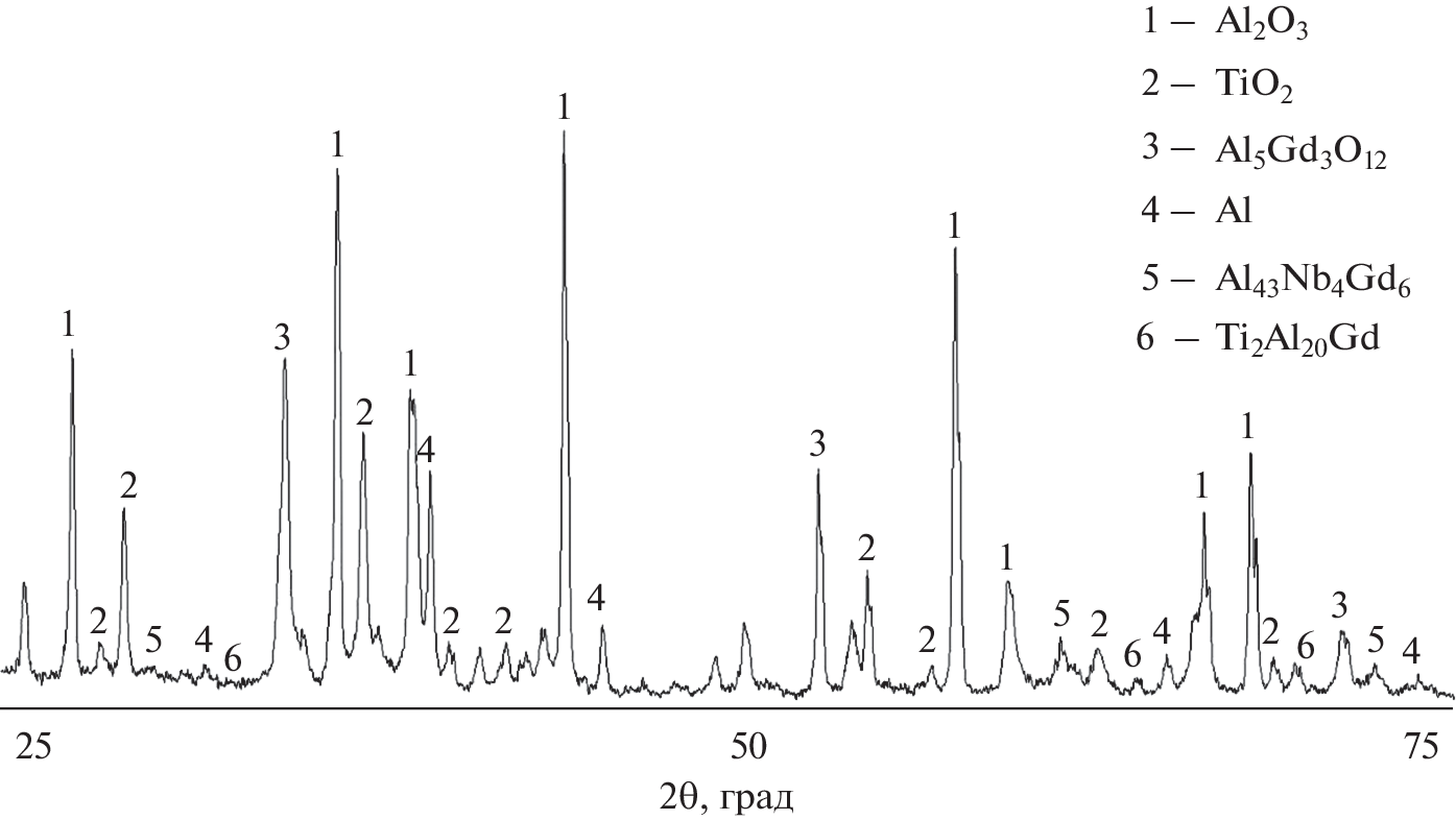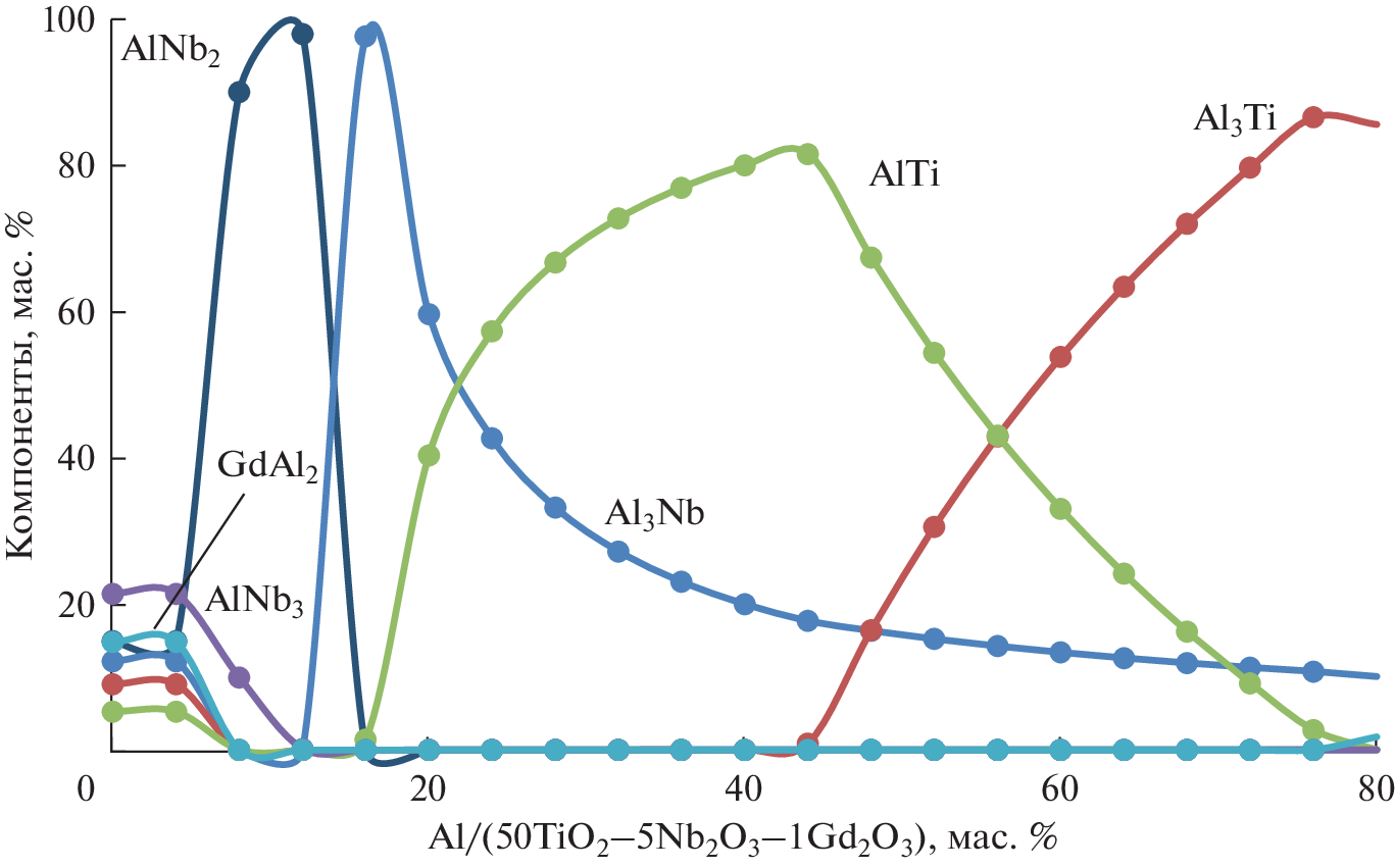 Alloys based on titanium and aluminum with additions of niobium and rare-earth metals have unique mechanical and heat-resistant properties, and also it likely that such alloys would have increased corrosion resistance. The method of thermodynamic modeling using the HSC program was used to study a system with aluminum consumption varying in the range from 0 to 100% of the mass of the initial charge. The features of phase formation in Al–[50TiO2–5Nb2O5–1Y2O3 (Gd2O3)] systems have been studied. The calculation of the heat balance of the process at 1600°C and 44% of Al was – 0.196 MJ per 1 kg of charge, which indicates the possibility of its occurrence with only the aluminothermic reactions. The reduction of titanium and niobium can proceed by reactions through the formation of their oxides of lower valency – TiO, NbO2, NbO. The aluminothermic reduction of gadolinium is thermodynamically possible only at temperatures below 1200°C. The reduction of yttrium through the interaction of Y2O3 with aluminum with the formation of AlY, Al2Y3 AlY2 compounds for the range of 1000–1800°C is thermodynamically impossible. The results of thermodynamic modeling of interactions correlated well with the data of differential thermal and X-ray phase analysis using STA 449 F3 Jupiter (NETZSCH) synchronous thermal analysis and XRD-7000 diffractometer (Shimadzu) with automatic program control, respectively. It was found that the process enters the active phase after the appearance of liquid aluminum and, apparently, is accompanied by exothermic effects with the formation of double and triple intermetallic compounds of aluminum with rare (Nb, Ti) and rare earth (Gd, Y) metals. Transformation of titanium dioxide and niobium pentoxide in the process of transformations is likely carried out through successive and parallel stages of formation of simple and complex oxides with low oxidation states. At the initial stages of the interaction of aluminum with oxides, niobium and titanium aluminides are mainly formed. At subsequent stages, the formation of more complex compounds is observed. At temperatures above 1300°C, ternary intermetallic compounds Al43Nb4Gd6, Ti4Al20Gd and Ti4Al3Y6, Al3Ti, Al0.23Nb0.07Ti0.7 are formed. Gadolinium and yttrium tend to form complex intermetallic compounds in such systems.