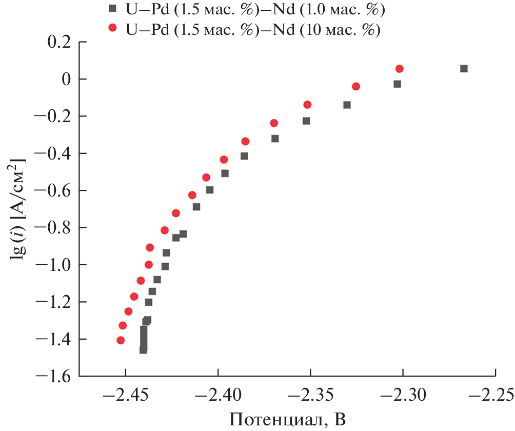 At the reprocessing module of the pilot demonstration power complex site of the Siberian Chemical Combine, a combined technological scheme for the reprocessing of mixed nitride uranium-plutonium spent fuel consisting of pyrochemical operations, hydrometallurgical refining of uranium, plutonium and neptunium is implemented step by step. According to this scheme, the target pyrochemical reprocessing products, purified from the main mass of fission products with actinoid content not less than 99.9%, are sent for hydrometallurgical reprocessing. For pyrochemical reprocessing it is necessary to develop a technology of electrorefining of metallised spent nuclear fuel. To carry out electrolytic refining it is necessary to define processes and regimes of anodic dissolution of alloys simulating product of this head operation “metallization”. In the present work the results of investigations of processes of anodic dissolution of U–Pd and U–Pd–Nd model alloys with different concentrations of palladium and neodymium in melts based on 3LiCl–2KCl–UCl3 (10.1 wt % UCl3) at 550°C using different methods are presented. Uranium alloys containing palladium and neodymium were prepared by direct alloying of uranium metal and palladium metal powders of PdAP-1 grade, and neodymium metal (99.99%) in high-purity argon medium (99.998%). Electrochemical measurements were performed using an Autolab 302N potentiostat/halvanostat equipped with a Booster 20A high-current module. The anodic polarisation curves consist of only one oxidation wave which was attributed to the dissolution of uranium metal. Increasing the palladium content in the alloy from 1.5 to 10.0 wt %, does not affect the shape of the polarisation curves. The increase of neodymium content in the alloy from 1.0 to 10.0 wt % also does not affect the shape of polarization curves. Electrorefining parameters of uranium alloys containing palladium and neodymium were determined. The limiting current density of uranium evolution from uranium alloys containing palladium and neodymium in the electrolyte 3LiCl–2KCl–UCl3 (10.1 wt % UCl3) at 550°C was 0.4 A/cm2. It was shown that palladium does not diffuse into the melt as a result of anodic dissolution and neodymium accumulates in the electrolyte only when the alloy is refined with 10.0 wt % neodymium, which is much higher than the future real concentrations of electrotreated uranium alloy components in the technological chain of spent nuclear fuel processing.
