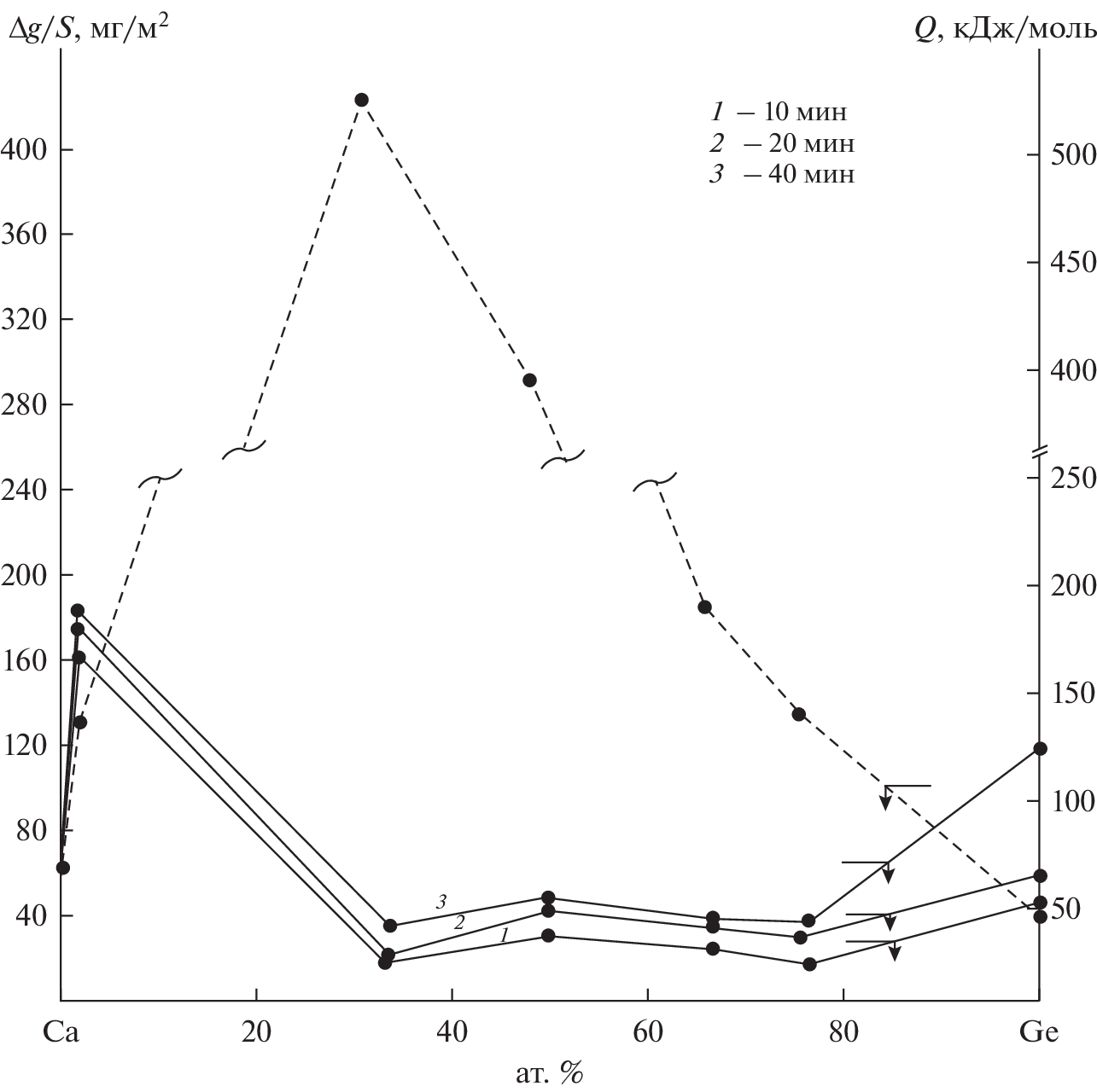 With the introduction of complex alloys and metals – reoxidizers into liquid steel, their waste is observed, or more precisely, oxidation by the gas phase of the furnace. To select the optimal composition of complex deoxidizers, it is necessary to know the physicochemical laws of this process, which are little studied. To study the kinetics of oxidation of metal melts, the method of continuous sample weighing is used, which is usually used in the study of high-temperature corrosion of solid metals. The mechanism of interaction of liquid metals with oxygen is similar in nature to high-temperature gas corrosion of solid metals. In both cases, adsorption of gas molecules on the metal surface, nucleation, and then growth of an oxide film take place. In this work, the kinetics of oxidation of Ca-Ge melts with atmospheric oxygen was studied using thermogravimetry, IR spectroscopy, and X-ray phase analysis. It is shown that germanium additions up to 33.3 at % increase the resistance of melts to oxidation. An increase in temperature contributes to an increase in the rate of oxidation of melts of the Ca–Ge system. The process of oxidation of the investigated melts obeys the parabolic law. The true rate of oxidation is on the order of 10–4 kg · m–2 · s–1. The apparent activation energy of oxidation, depending on the composition of the alloys, is 39.8–526.7 kJ/mol. The products of melt oxidation are СaGe4О9 and GeО2. The mechanism of the influence of germanium on the kinetics of oxidation of Ca-Ge melts has been established. The CaGe4O9 oxide plays a dominant role in the formation of a protective oxide film.