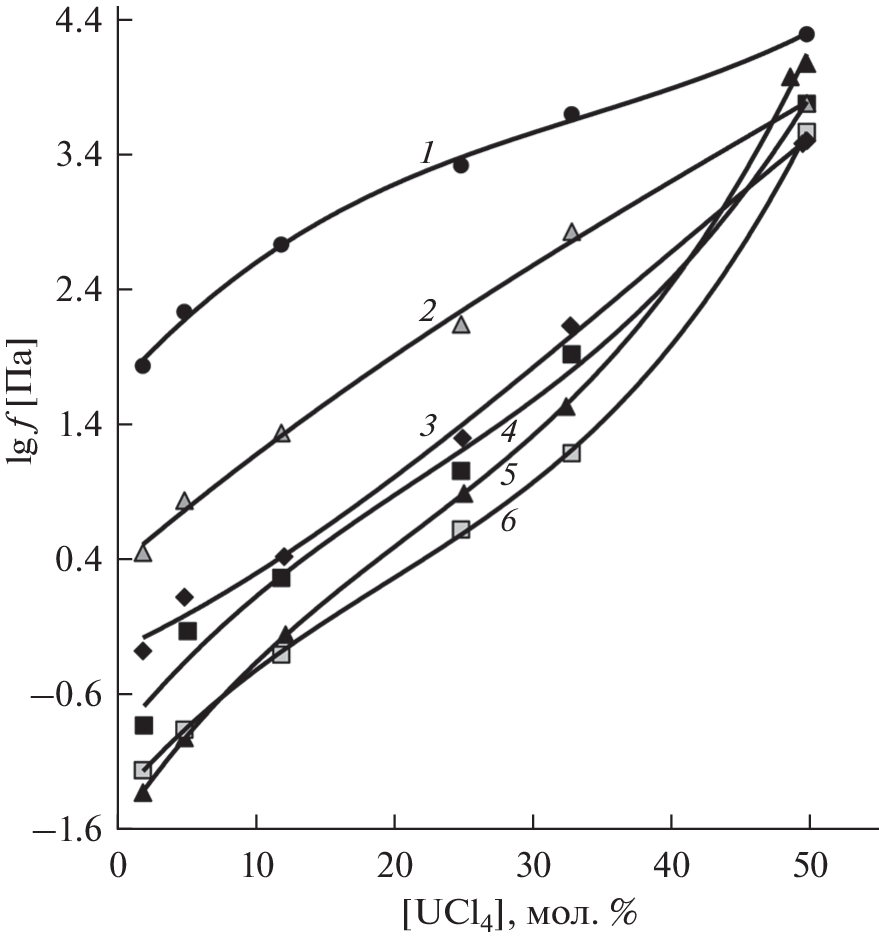 Based on our experimental data and those obtained by researchers, mainly employees of our Institute (IHTE UB RAS), the regularities of changes in the composition of saturated vapors and the volatility of components of molten mixtures of tetrachlorides of uranium and some other metals (ThCl4, HfCl4, ZrCl4, TiCl4) with alkali metal chlorides depending on the temperature, concentration and cationic composition of melts are discussed. It is noted that the dissolution of UCl4 as well as other tetrachlorides in molten alkali metal chlorides is accompanied by complexation, manifested in a sharp decrease in the volatility of the corresponding tetravalent metal chloride and its content in saturated vapors. The strength of the complex chloride anions of polyvalent metals formed in melts increases significantly with a decrease in their concentration, replacement of the solvent salt in the series from LiCl to CsCl and temperature. As a result, the volatility values of UCl4, ThCl4, HfCl4, ZrCl4, TiCl4 and the composition of vapors above their solutions in ionic melts vary greatly. At the same time, according to the experimental data hafnium, zirconium and titanium tetrachlorides (especially TiCl4), which are much more volatile in the individual state, have higher volatility and content in saturated vapors over solutions in molten alkali metal chlorides.