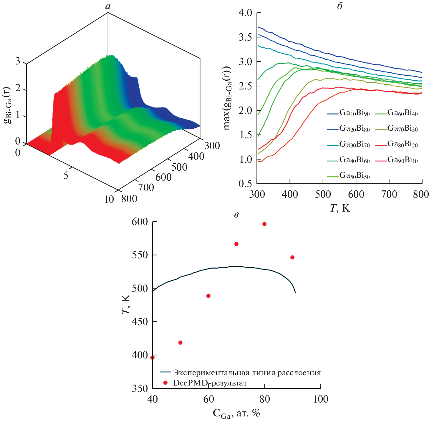 In present work, the process of stratification in melts of the Bi–Ga system was simulated using molecular dynamics method. The interaction between atoms was specified using a neural network potential parameterized on ab initio data (DeePMD model). The parameterization of the DeePMD potential was performed using an active machine learning algorithm. During molecular dynamics simulation, melts with the compositions GaxBi100 – x where x = 0, 10, …, 90, 100 were cooled from 800 to 300 K. The phase separation was registered by changes in the temperature behavior of the partial radial distribution function for the Ga–Bi pair. It has been established that the DeePMD potential, in the initial training set of which no configurations corresponding to the phase separated state were introduced, is still able to reproduce the stratification in the Bi-Ga system. The concentration range of separation determined by molecular dynamics modeling with the DeePMD potential coincides with the experiment. It was also possible to correctly determine the shift of the maximum of the stratification dome towards melts rich in gallium. However, the stratification dome maximum was incorrectly defined as Ga80Bi20 instead of the experimental Ga70Bi30. In addition, a certain temperature range of the delamination dome is wider than in the experiment. Despite this, the use of neural network potentials in atomistic simulations, as shown in present work, can be effectively used to predict delamination in binary metallic systems.