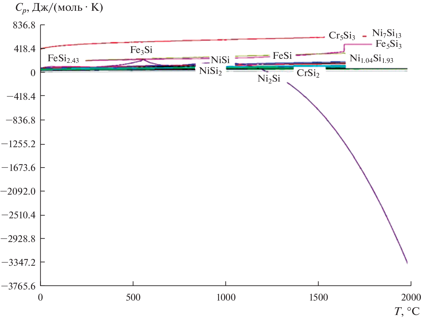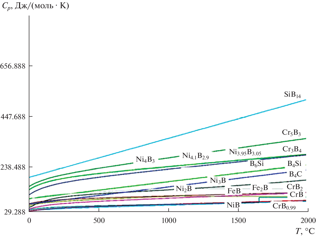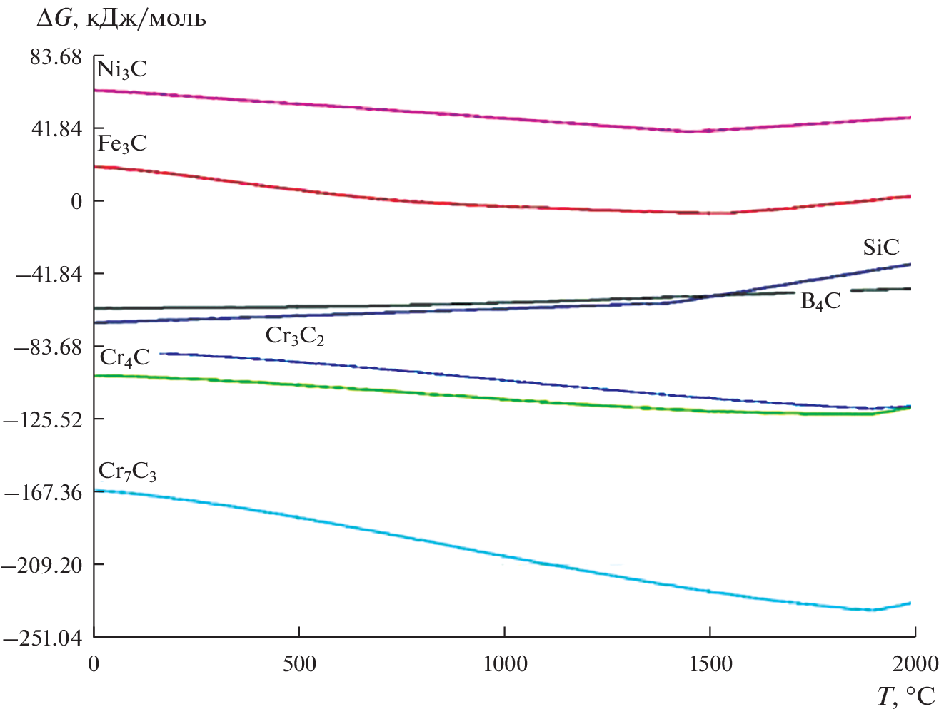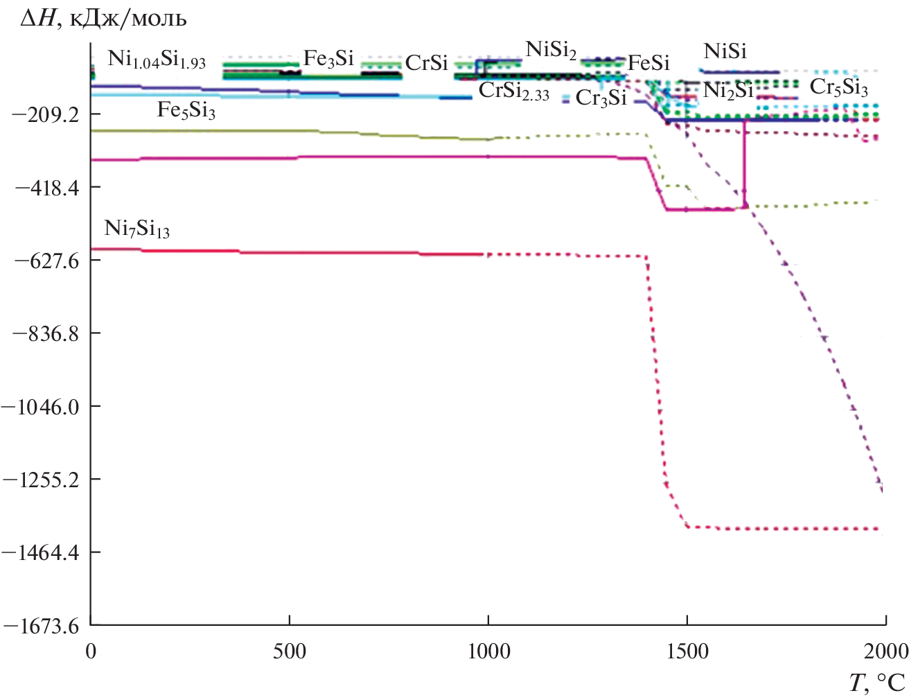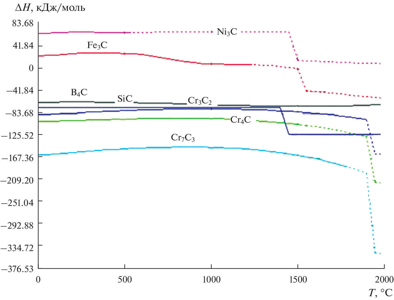 To determine thermochemical characteristics: enthalpy, molar heat capacity and Gibbs energy of formation of silicides, borides and carbides in an alloy of a given composition (40Fe–31Ni–16Cr–5Cu–5Si–2B–1C) calculation methods were used using mixed GGA and GGA + U schemes (semi-empirically tuned generalized gradient approximations). Three modules of the HSC Chemistry 6.0 software package (Metso Outotec, version 6.0, Espoo, Finland) were used in the study. First, the “Reaction Equation” module was used to calculate the change in Gibbs free energy at different temperatures. Secondly, to calculate the composition of each chemical in the equilibrium state, the module “Equilibrium Composition” was used (“Equilibrium compositions” – calculation of equilibrium compositions of phases in the presence of reversible chemical reactions). Thirdly, the module “H, S, C and G diagrams” (“Graphs of thermodynamic functions” – plotting thermodynamic functions) was used to determine the relative phase stability of compounds depending on temperature in the form of Ellingham diagrams. The results of thermochemical modeling showed that the temperature dependences of the heat capacity of the formation of hardening compounds in the alloy increase with increasing temperature. Thermodynamic calculations of the enthalpies of the hardening phases in the alloy showed that at temperatures >1400°C, silicides, borides, and carbides are formed. ∆G(T) of silicides, there is an increase in the values of the Gibbs energy and a tendency towards stability with increasing temperature. During the formation of borides in the alloy, one can see a strong absorption of heat, an increase in the Gibbs energy in the studied temperature range. The results of calculating the Gibbs energy as a function of temperature showed the formation of carbides Ni3C, Fe3C, SiC, B4C, Cr3C2, Cr4C, Cr7C3. The formation of phases occurs with a decrease in the values of the Gibbs energy to a temperature of ~1500°C. A further increase in temperature indicates the absorption of heat, which is associated with a high ordering temperature of the carbide structures. Thus, the thermochemical study justified the formation of silicides, borides, carbides in the alloy 40Fe–31Ni–16Cr–5Cu–5Si–2B–1C.