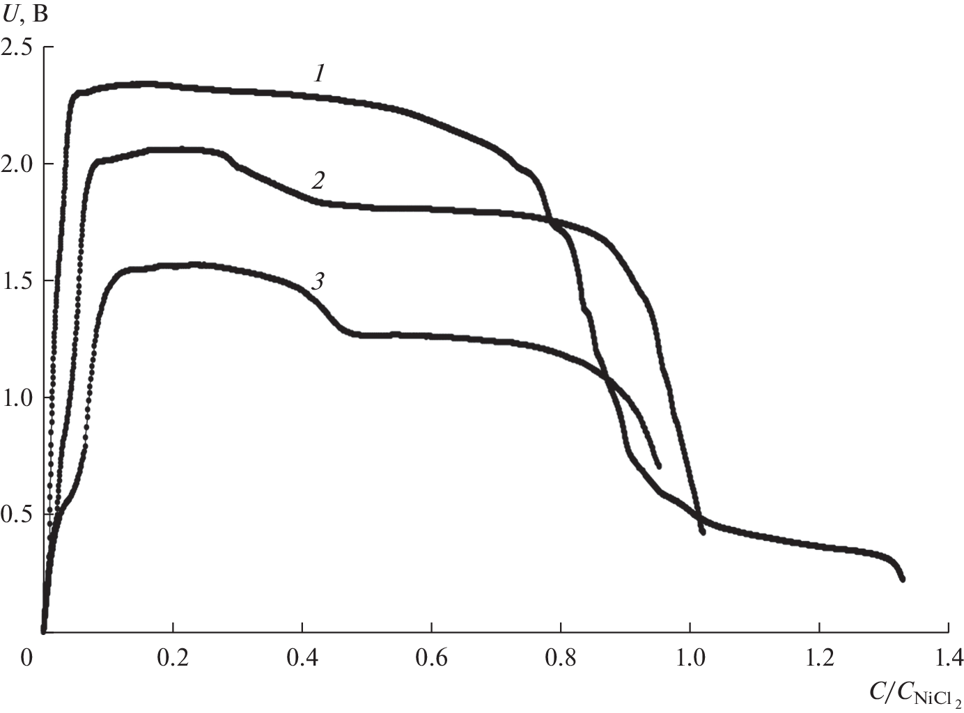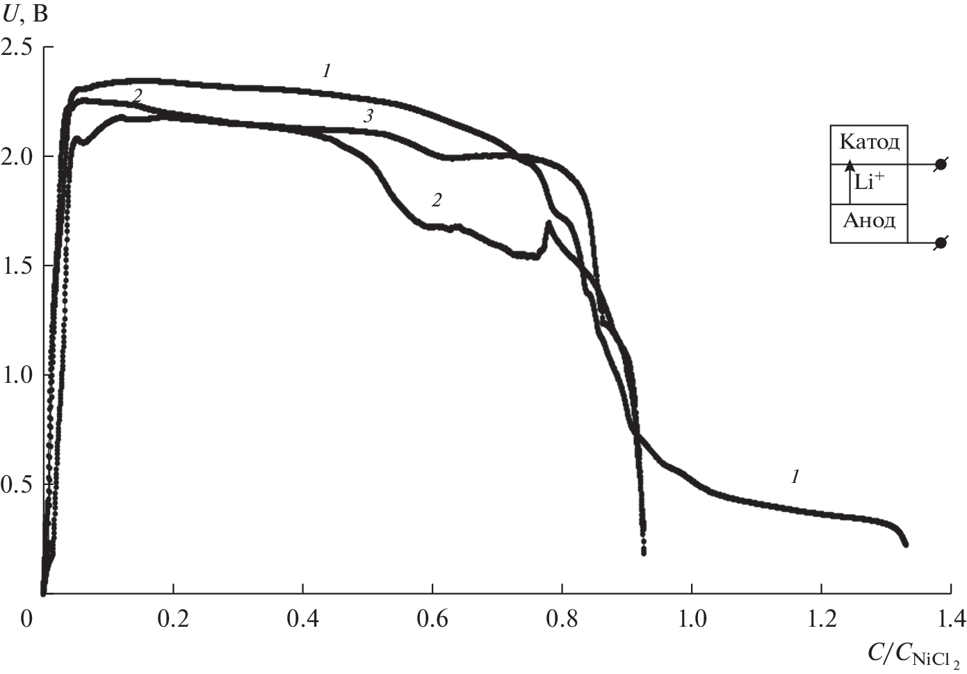 The discharge characteristics of the elements of a thermally activated chemical current source (HAB) containing NiCl2–CoF2–MoO3 mixtures as a positive electrode are investigated. It is established that molybdenum oxide stabilizes the discharge plateau and increases the discharge voltage at temperatures above 530°C. The discharge curve has a stepwise character. The number of steps of the discharge curve is determined by the operating conditions of HAB. The low-voltage stage (less than 0.4 V) corresponds to the reduction of lithium molybdates, which are formed by the interaction of molybdenum oxide with the reduction products of transition metal halides. A study of the cathode reduction products by the methods of XRD, STA and SEM was carried out. It is established that during the discharge of the HAB element, the initial components of the cathode mixture are restored to metals that form a dendritic matrix. The DSC curves of the salt fraction formed during electrochemical reactions have a number of thermal effects corresponding to the temperatures of joint melting of a triple mixture of lithium halides LiF–LiCl–LiBr and eutectic dual systems LiF–LiCl, LiCl–Li2O, in which transition metal halides and lithium molybdates are dissolved.