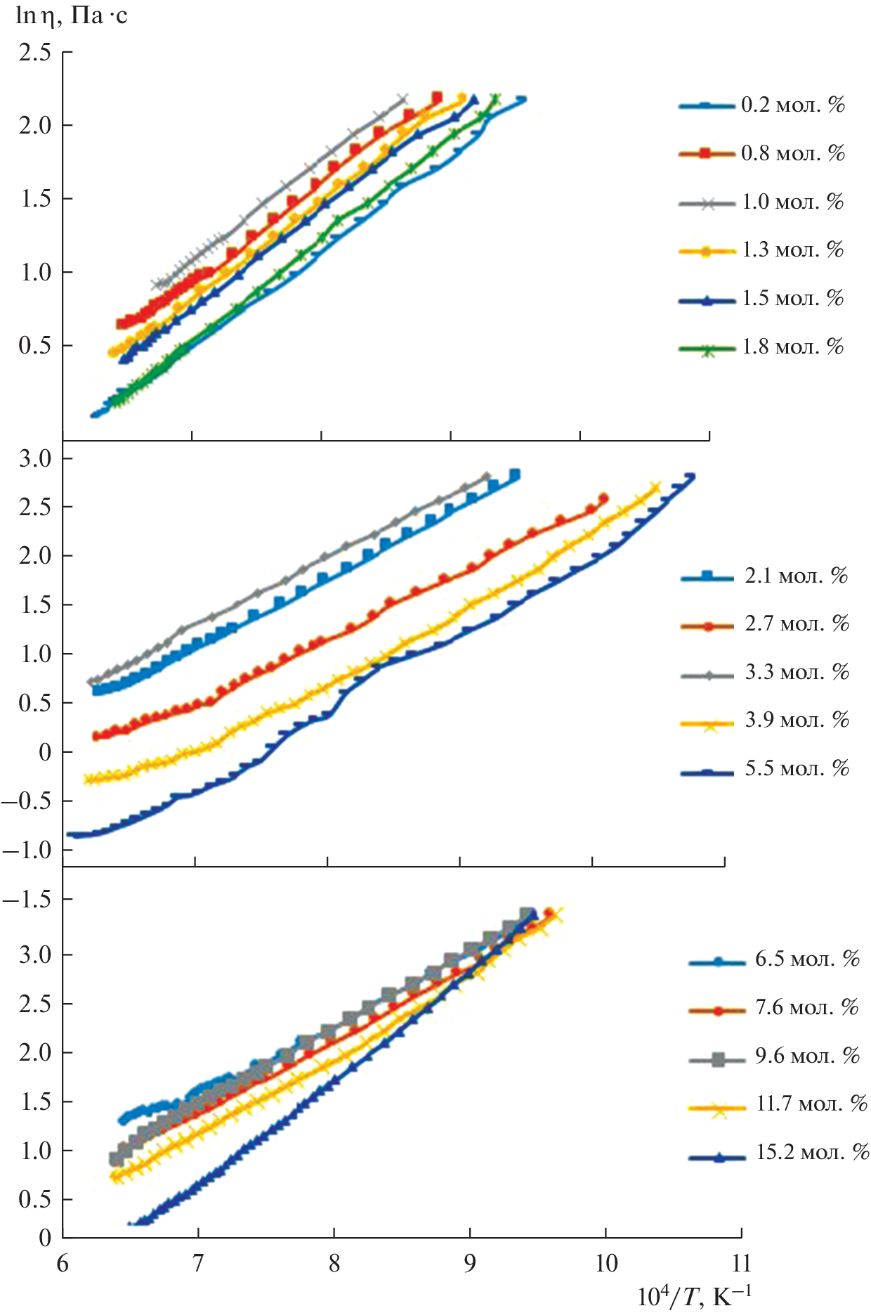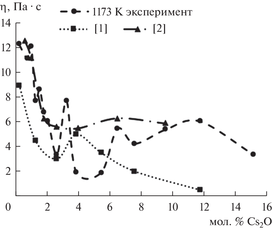 Эффективная вязкость (вязкоупругость) цезиевоборатных расплавов измерена в интервале температур 900–1600 K и концентраций 0 ≤ x ≤ 16 мол. % Cs2O вибрационной вискозиметрией. Показано, что вибрация приводит к неньютоновскому характеру движения расплавов. Это означает, что с энергией активации вязкого течения связаны не только конфигурационная энергия активации, энергия переключения мостиковых кислородных связей, но и энергия упругости структурных единиц расплава. Используя параметры в условиях ньютоновского и неньютоновского течения расплавов, были вычислены сдвиговая вязкость η', модуль упругости G ' и запасенная вязкость η''. Было показано, что цезийборатные расплавы в условиях высоких скоростей сдвига можно рассматривать как жидкости, обладающие вязкостными и упругими свойствами. Методом ДСК измерена температура стеклования (Tg, K), построена и объяснена ее зависимость от содержания оксида цезия.