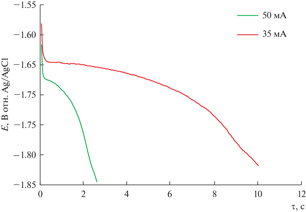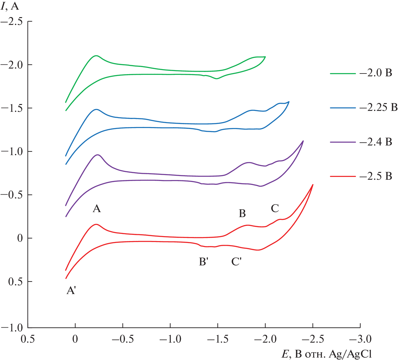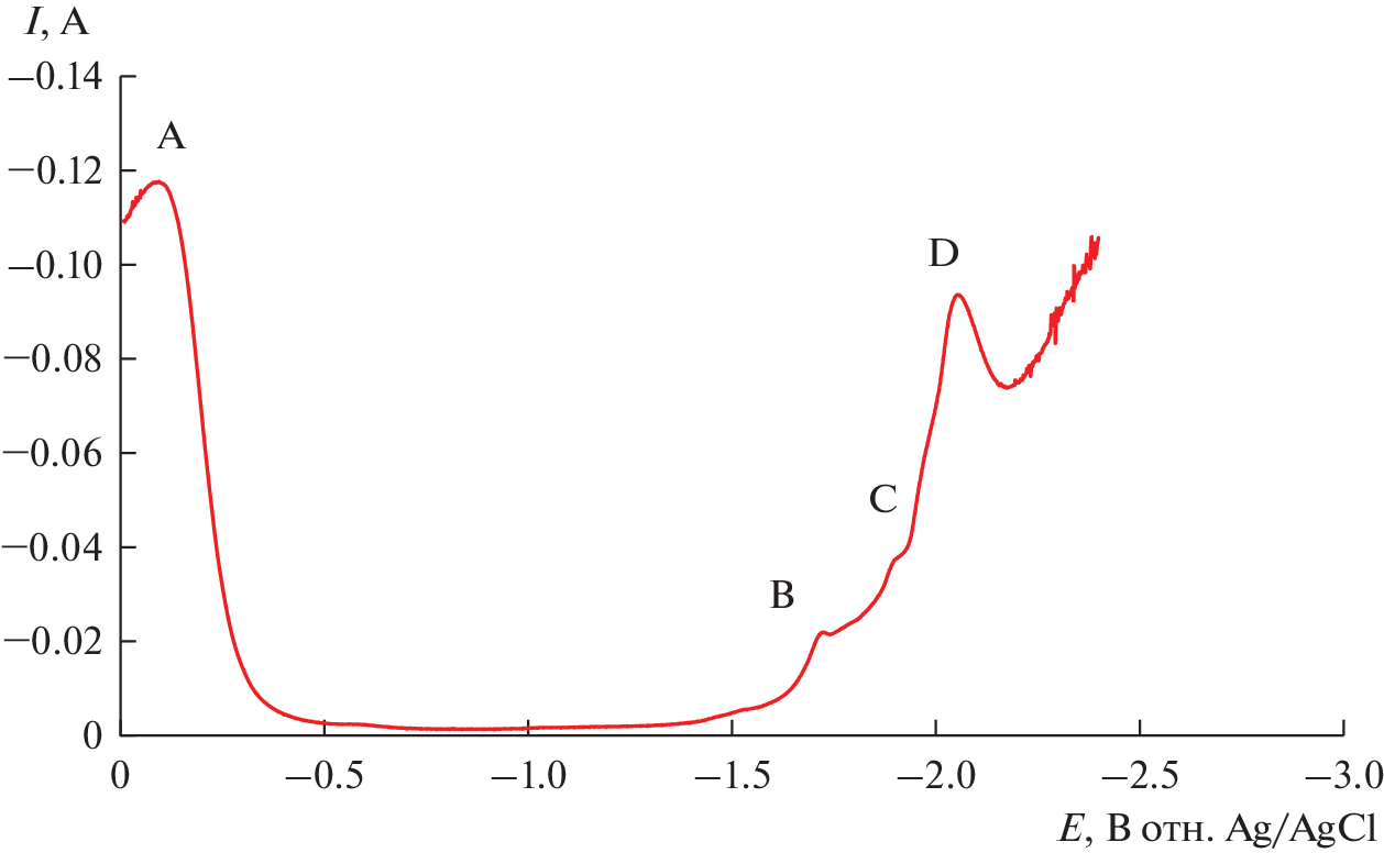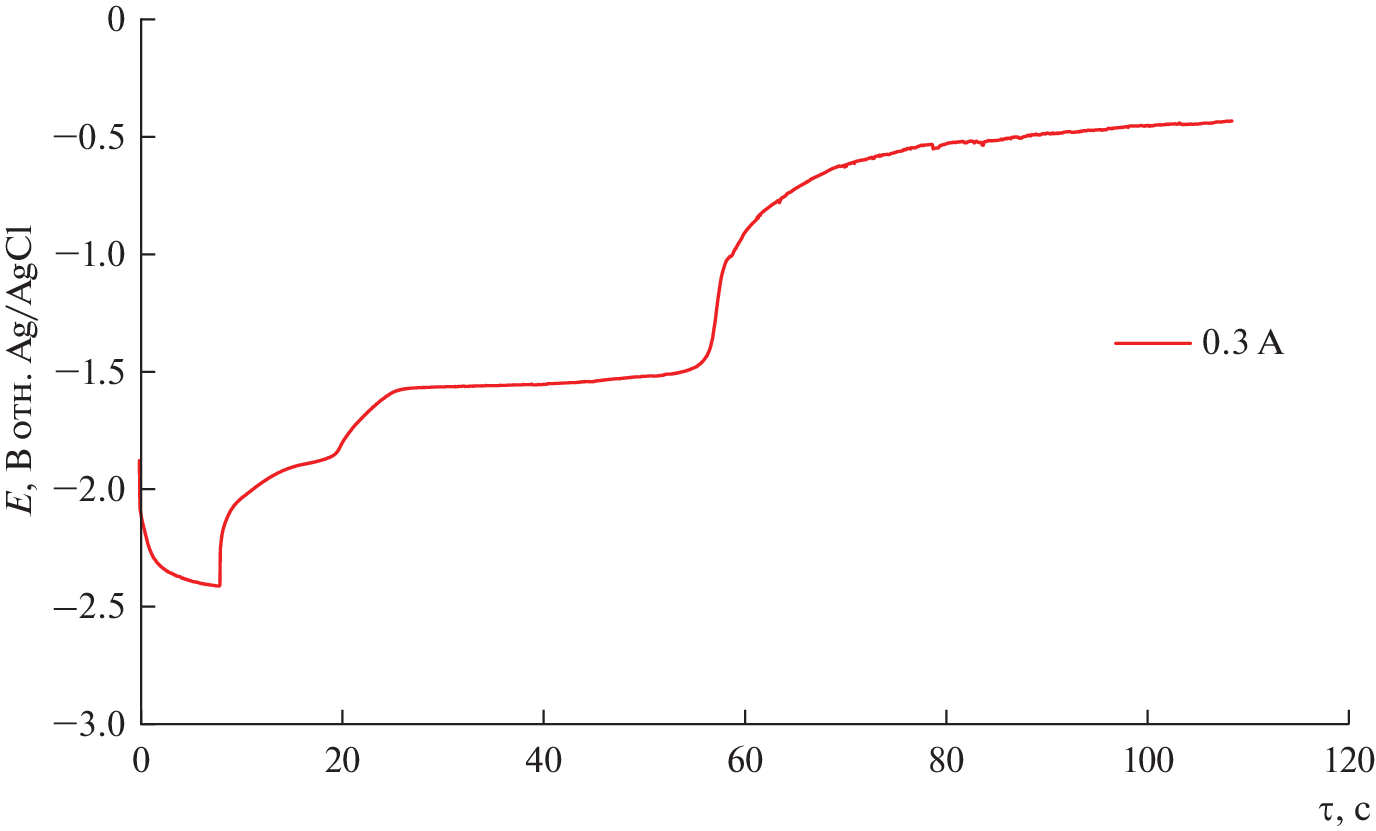 The electrochemical behavior of lanthanum ions on a nickel electrode has been studied using various electrochemical methods such as cyclic voltammetry, chronopotentiometry, open circuit chronopotentiometry (on-off curves), and square wave voltammetry in an equimolar melt of potassium and sodium chlorides at 973 K. The cyclic voltammetry curves has several reduction waves on the cathodic branch and corresponding oxidation waves on the anodic branch. The first wave A is located in the potential region –(0.0–0.1) V, where the reduction of Ni2+ ions takes place. The second wave B is in the region of potentials –(1.72–1.77) V, on it occurs electroreduction of ions \({\text{LaCl}}_{6}^{{3 - }}\) on nickel electrode with certain depolarization with formation of intermetallide of lanthanum with nickel LaxNiy. The appearance of the third wave C in the potential region –(2.09–2.13) V, we associate with the electroreduction of chloride complexes \({\text{LaCl}}_{6}^{{3 - }}\) on intermetallide LaxNiy with the formation of metallic lanthanum. On the basis of the obtained data it is shown that during the electroreduction of lanthanum chloride complexes in KCl–NaCl melt at T = 973K the nickel electrode interacts with the released lanthanum, causing a significant depolarization of the process of electroreduction of the chloride complex, also formation of intermetallide with Ni electrode occurs.