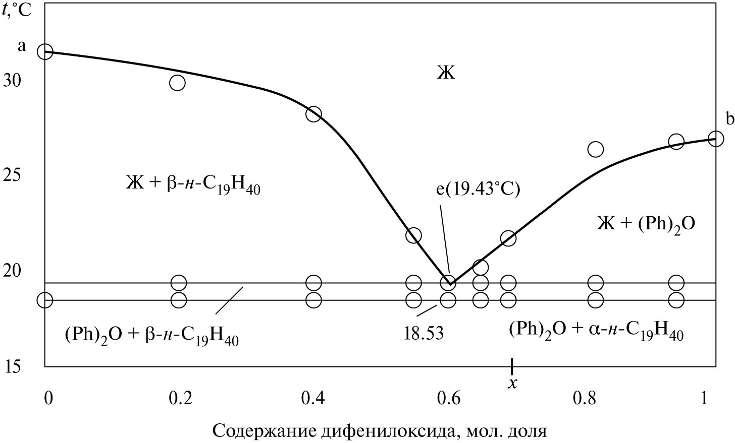 T-х-диаграмма двухкомпонентной системы включает в себя однофазное поле жидкого состояния (выше кривых ликвидуса aeb) и четыре двухфазных поля — твердых фаз в солидусе β-н-C19H40+(Ph)2O, α-н-C19H40+(Ph)2O, а также поля — Ж+β-н-C19H40, Ж+(Ph)2O. Кривым ликвидуса и эвтектике фазовой диаграммы системы (см. рис. 1) соответствуют моновариантные двухфазные равновесия (Ж ⇆ β-н-C19H40, линия ae; Ж ⇆ (Ph)2O, линия eb) и нонвариантное трехфазное равновесие Ж ⇆ β-н-C19H40+(Ph)2O, точка e. Кривые ликвидуса ае и bе пересекаются в эвтектической точке.