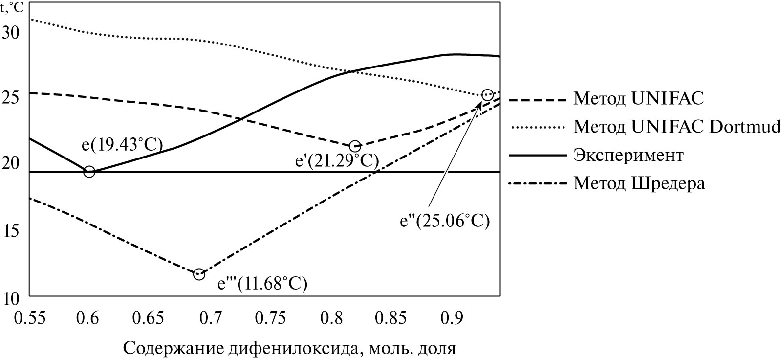 Расчетные значения координат эвтектики методами Шредера, UNIFAC и UNIFAC Dortmund приведены в табл. 3.