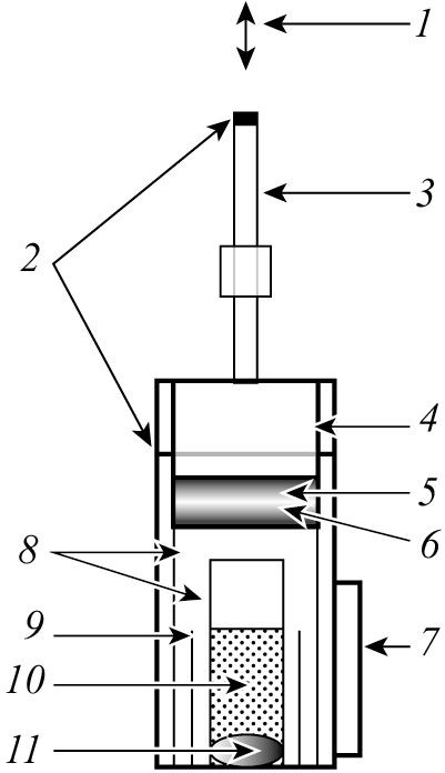 Рис. 1. 1 — Вакуумирование, вход аргона; 2 — места сварки; 3 — тонкостенная трубка; 4 — вкладыш; 5 — титановая крышка; 6 — танталовая крышка; 7 — карман для термопары; 8 — молибденовые тигли; 9 — молибденовые распорки; 10 — солевой расплав; 11 — церий.