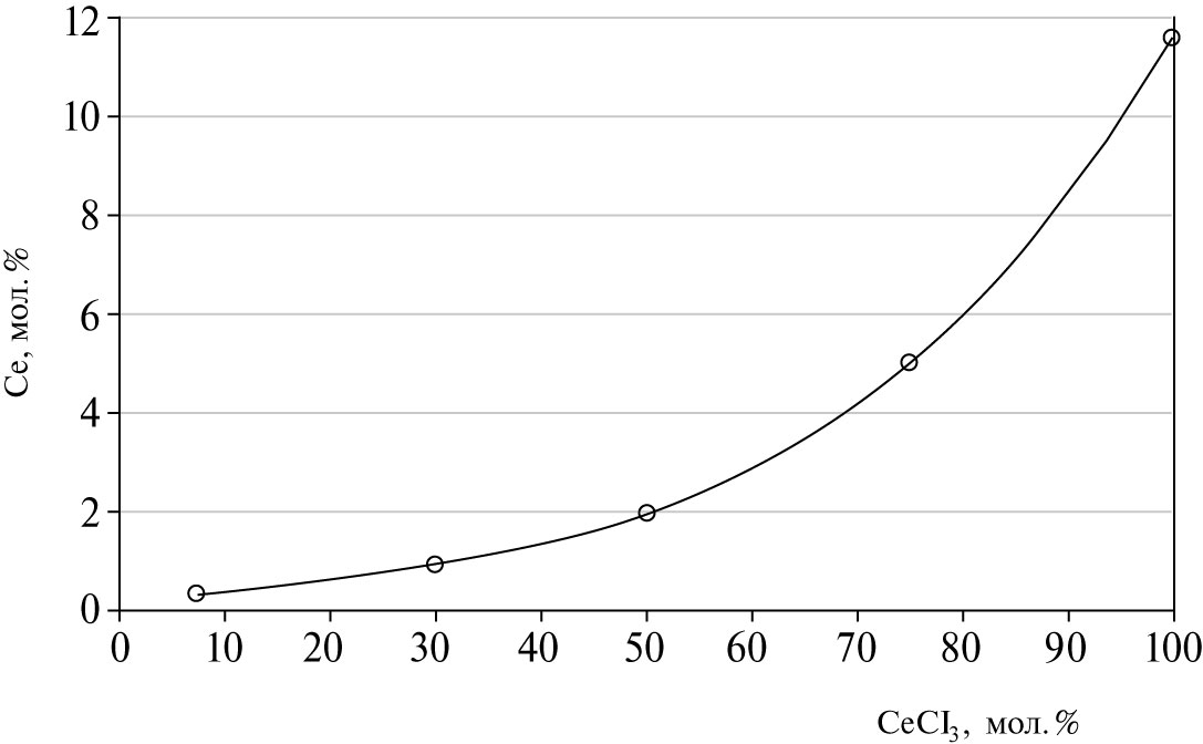Заметное количество щелочного металла было обнаружено только в эксперименте с самым разбавленным по трихлориду составом (10 мол. %), и даже в этом случае учет количества церия, потраченного на его образование, не оказал существенного влияния на значение концентрации растворенного в расплаве металлического церия.