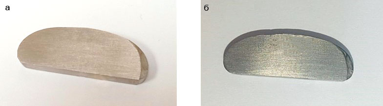 Рис. 1. Внешний вид образцов сплава Al₂₀Ni₂₀Co₂₀Cu₂₀Zr₂₀: а — исходный образец, б — образец после коррозионных испытаний.