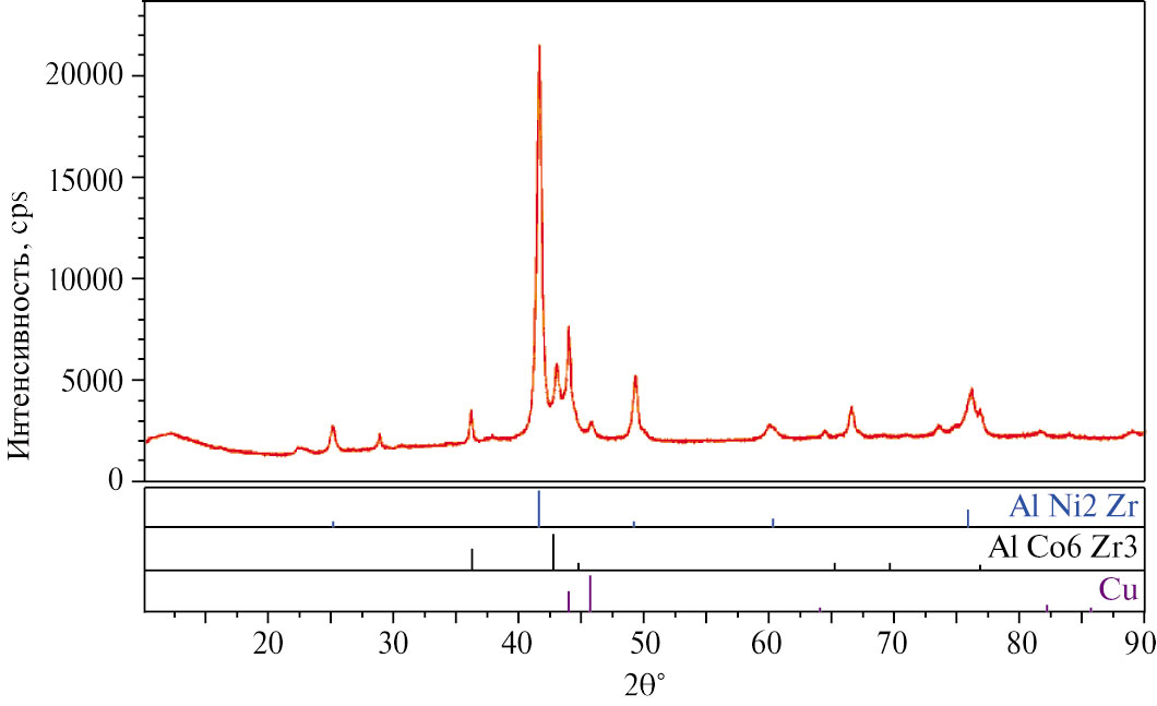 Рис. 4. Результаты рентгенофазового анализа, выполненного с поверхности шлифов поперечного сечения образцов сплава Al₂₀Ni₂₀Co₂₀Cu₂₀Zr₂₀ до коррозионных испытаний.