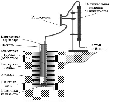 - Исследование остаточного содержания циркония в расплаве после отгонки летучих компонентов потоком инертного газа. Исследования проводились в ЦНИЛ АО ЧМЗ на оригинальной установке, схема которой представлена на рис. 2.