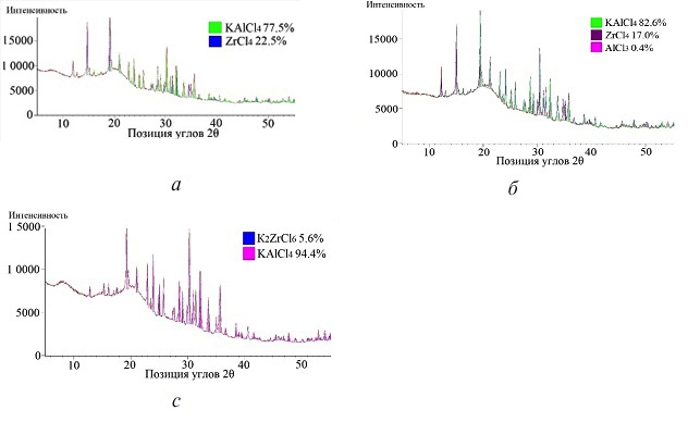 Рис. 4. Типичные дифрактограммы замороженных плавов: a – присутствие фаз KAlCl4 и ZrCl4; b – присутствие фаз KAlCl4, ZrCl4 и AlCl3; с – присутствие фаз KAlCl4 и K2ZrCl6.
