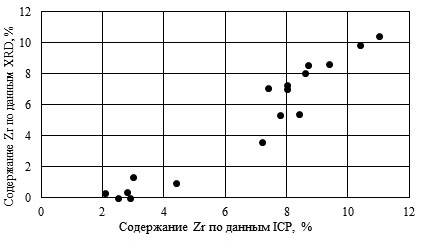 Рис. 5. Корреляция между содержанием Zr в кристаллических фазах ZrCl4 и K2ZrCl6 и содержанием Zr, определенным методом атомно-эмиссионной спектрометрии с индуктивно связанной плазмой.