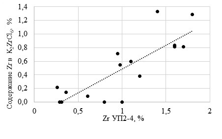 Рис. 6. Корреляция между Zr, определенным спектрометрическим методом в УП-4, и содержанием Zr в фазе K2ZrCl6.