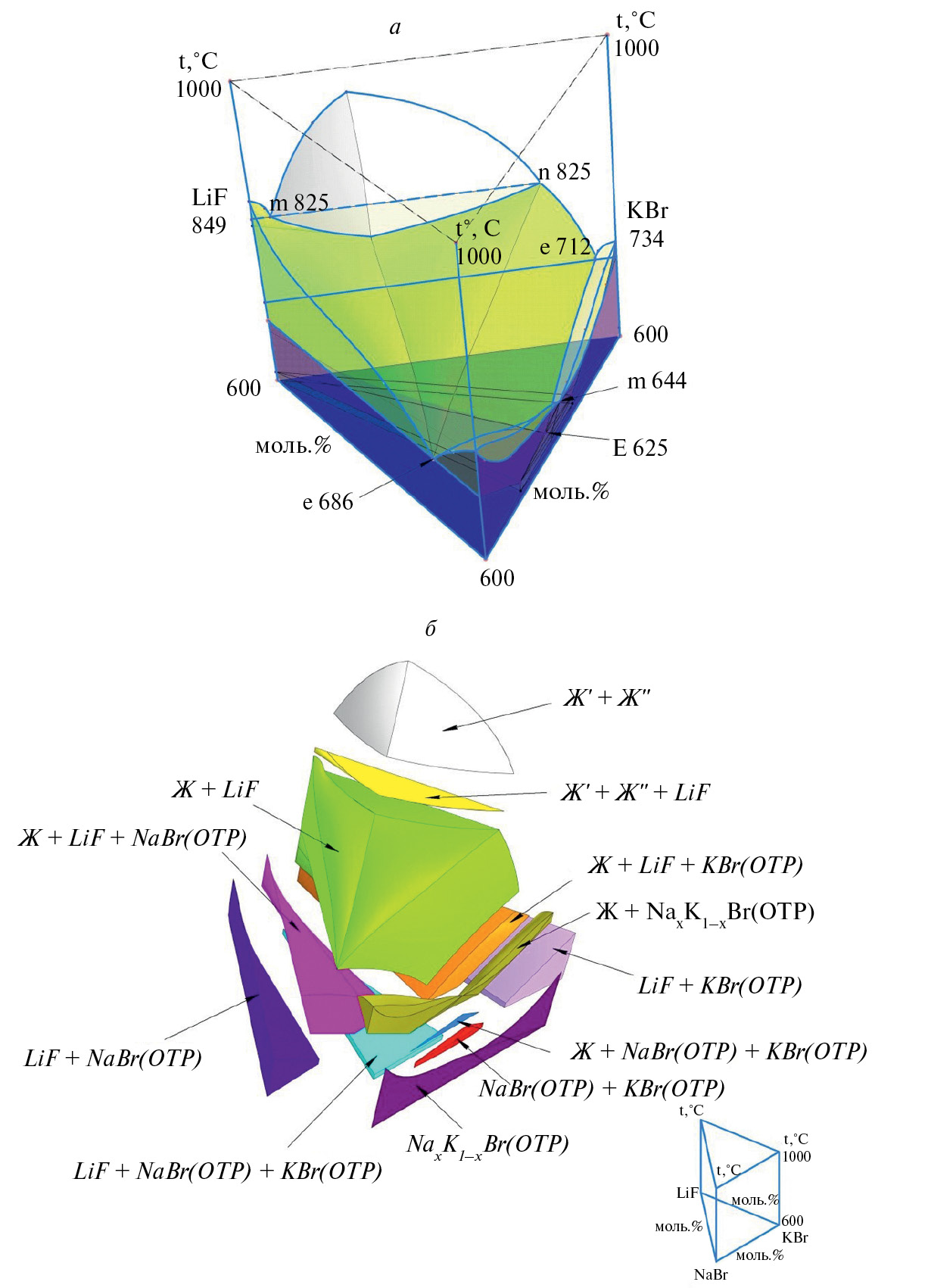 Рис. 3. 3D-модель квазитройной системы LiF–NaBr–KBr: а) фазовый комплекс системы; б) разъемная модель фазового комплекса.