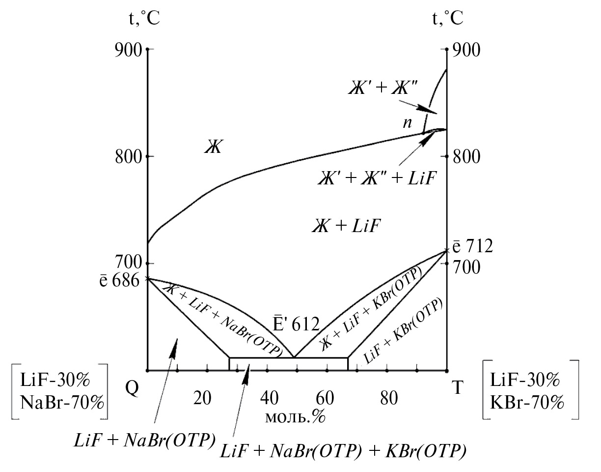 Полученная 3D модель позволяет построить политермические и изотермические разрезы. На рис. 4 приведена Т-х-диаграмма разреза QT (Q – 30 мол.% LiF + 70 мол. % NaBr; T – 30 мол. % LiF + 70 мол. % KBr), параллельного стороне NaBr–KBr треугольника составов. На рис. 5 приведена Т-х-диаграмма разреза K1K2 (K1–50 мол. % LiF + 50 мол. % NaBr; K2–50 мол. % LiF + 50 мол. % KBr), также параллельного стороне NaBr–KBr треугольника составов.