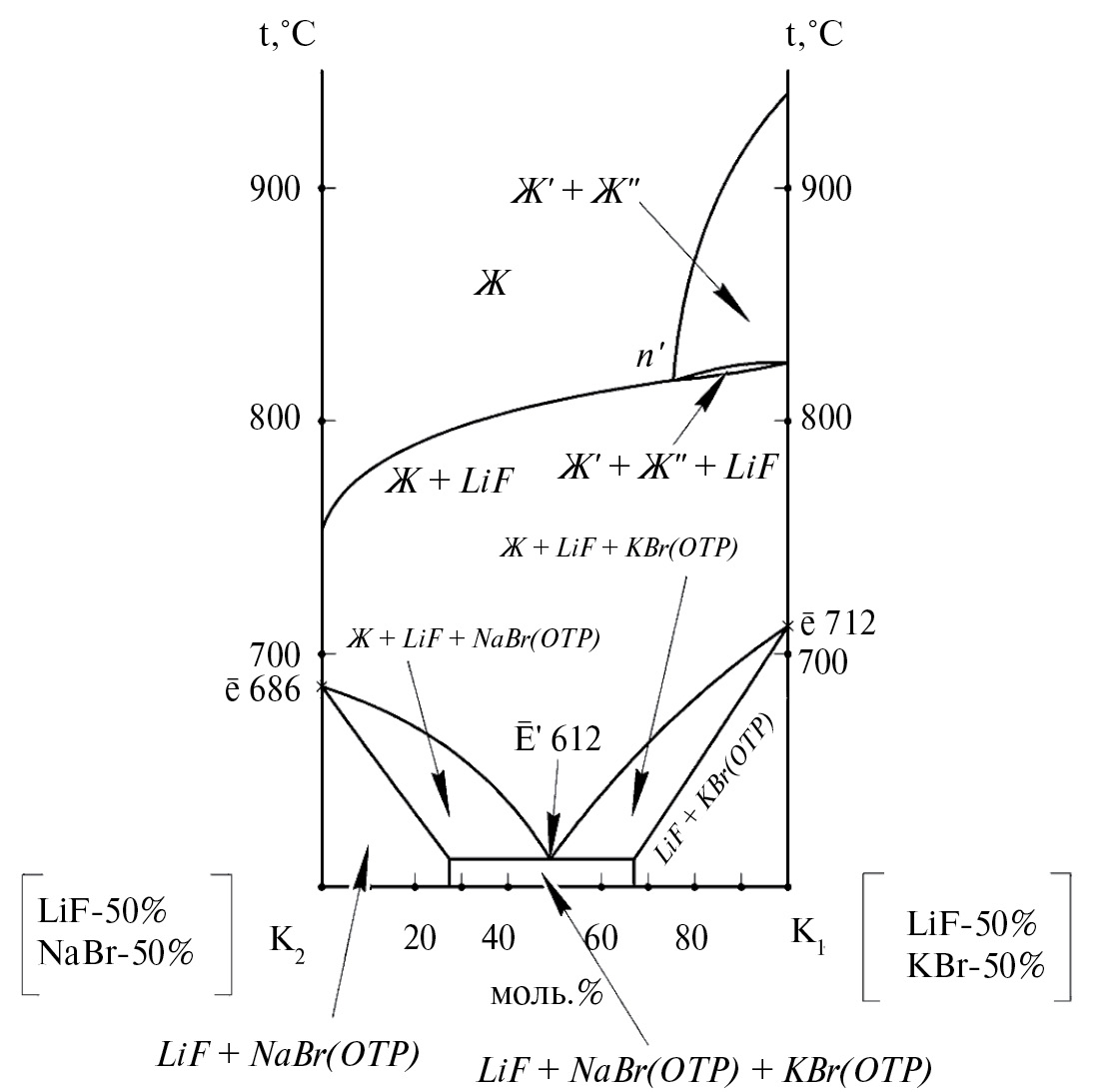 Построенные из 3D-модели T-x-диаграммы разрезов QT (рис. 4) и K1K2 (рис. 5) (линия конверсии K1–K2) имеют аналогичное строение и различаются только областями расслоения двух жидких фаз Ж′ + Ж′′. На диаграммах показан разрыв сплошности непрерывного ряда твердых растворов NaxK1-xBr с образованием квазитройной эвтектики, проекция которой на разрезах отмечена как 612. Отмечены на диаграммах выше ликвидуса однофазное поле жидкости, четыре двухфазных поля (Ж′ + Ж′′, Ж + LiF, LiF + NaBr(ОТР), KBr(ОТР) + LiF) и четыре трехфазных поля (Ж′ + Ж′′ + LiF, Ж + LiF + KBr(ОТР), Ж + LiF + NaBr(ОТР), NaBr(ОТР) + KBr(ОТР) + LiF)).
