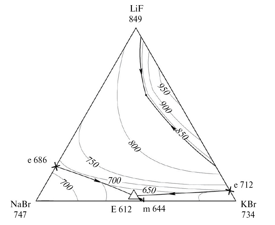 Применение расплавов из солей лития, натрия и калия в современных науке, технике и технологии связано с теплоаккумулирующими материалами [1, 2, 3], электролитами для химических источников тока [4–6], для жидкосолевых ядерных реакторов [7]. Применение расплавов в различных областях промышленности и научных исследованиях основано на изучении свойств расплавов и химических процессов, протекающих в них [8]. Расплавленные фториды находят применение в качестве жидкого топлива и теплоносителей в ядерно-энергетических системах [9]. Многие применяемые солевые смеси галогенидов включает два и более компонентов [10]. Для разработки перспективных в прикладном отношении низкоплавких сплавов необходима исчерпывающая информация о фазовых равновесиях с участием указанных солей [11]. Знания о термической стабильности солевых смесей повышают эффективность их применения [12, 13]. Целью настоящей работы является построение 3D-модели фазовых равновесных состояний квазитрехкомпонентной системы LiF-NaВr-KВr, входящей в четырехкомпонентную взаимную систему Li+, Na+, K+ || F–, Вr–, описание и исследование полей кристаллизации и реакции ионного обмена 2LiBr + NaF + KF = 2LiF + NaBr + KBr.