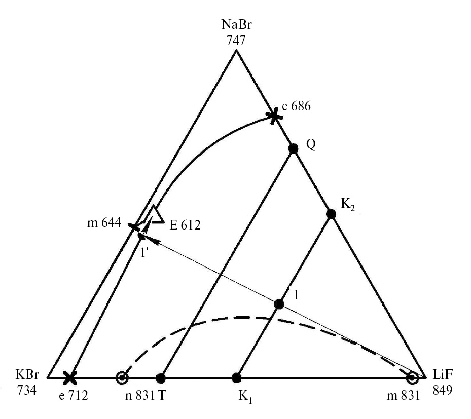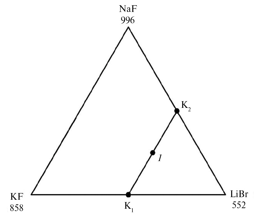 Рис. 8. Расположение смеси 1 на линии конверсии K1–K2 в нестабильном треугольнике NaF–KF–LiBr.