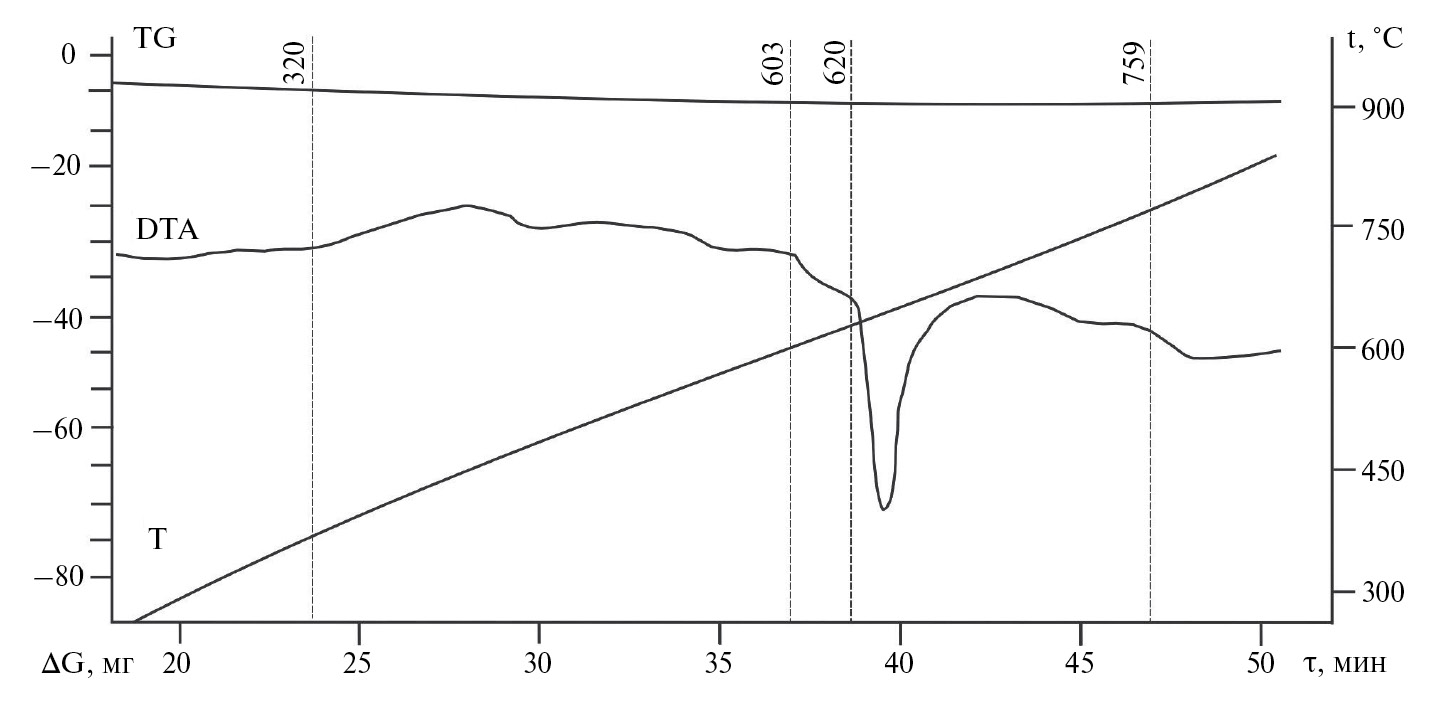 Рис. 9. Дериватограмма нагревания смеси порошков 50٪ LiBr + 25% NaF + 25% KF.