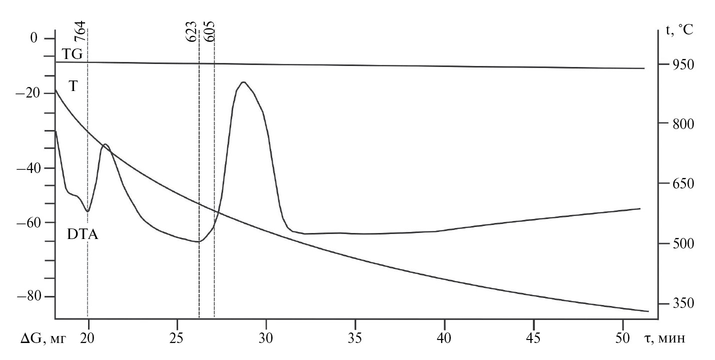 Экспериментальное исследование химического взаимодействия по методике, предложенной в [25], исследовано с использованием дифференциального термического анализа и термогравиметрии на дериватографе МОМ Q-1500D в режиме контролируемой скорости нагрева 20o/мин от 25 до 850 оC в платиновых тиглях для дериватографа с нижним подводом термопар [26–29]. Масса навесок составляла 1 г. Все составы – эквивалентные доли, выраженные в процентах. Квалификация исходных реактивов: LiBr, NaF, KF – «х.ч.», индифферентное вещество – свежепрокаленный оксид алюминия «ч. д. а.» Температуры плавления веществ соответствовали справочным данным [22, 23]. Рентгенофазовый анализ (РФА) составов проводили на дифрактометре ARL X'TRA. Съемку дифрактограммы осуществляли в CuKα-излучении с никелевым β-фильтром.