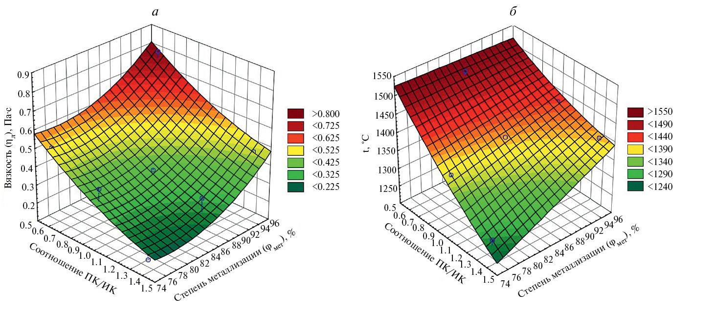 На рис. 2 представлен вид функций отклика – вязкости шлака (рис. 2а) и температуры ликвидуса (рис. 2б), которой она соответствует, в зависимости от соотношения ПК/ИК и степени металлизации смеси концентратов φмет.