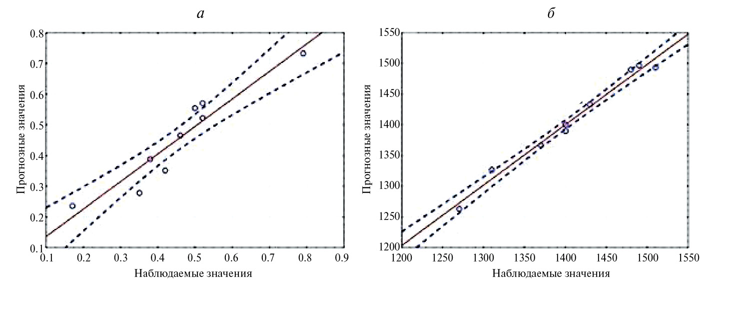 Для проверки адекватности расчетной модели, описанной уравнением регрессии, выполнено сопоставление экспериментальных и расчетных значений вязкости и температуры ликвидуса. Сравнение методом корреляционного анализа результатов прямых измерений и прогнозных расчетов, представленных на рис. 4, показало, что практически все экспериментальные данные располагаются в доверительном интервале, ограниченном эллипсом надежности критерия.