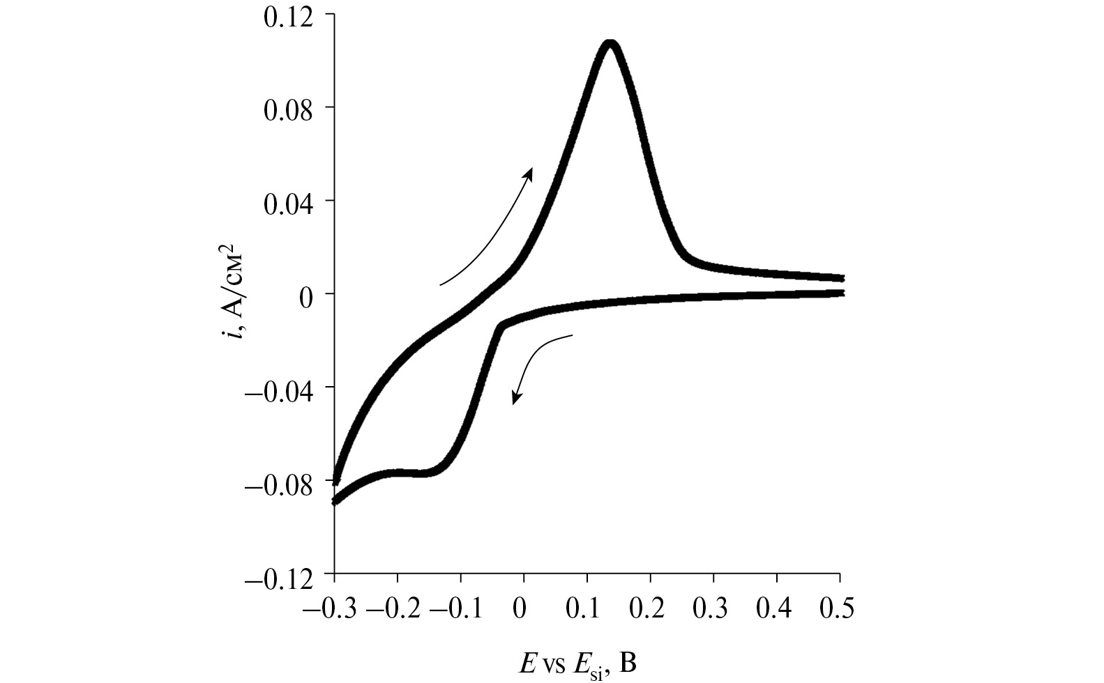 Вольтамперометрия в расплаве KI–KF–KCl–K2SiF6. Для определения параметров (потенциал, ток) электроосаждения кремния на стеклоуглероде в расплаве KI–KF–KCl–K2SiF6 методом циклической вольтамперометрии была получена вольтамперная зависимость, которая приведена на Рис. 1. Исследуемый процесс начинается при потенциалах отрицательнее 0 В относительно кремниевого квазиэлектрода сравнения с формированием единственного катодного пика электровосстановления ионов кремния при потенциале около –0.17 В и катодной плотности тока 0.08 А/см2. Дальнейшее смещение потенциала стеклоуглерода приводит к выделению калия и разрушению электрода. При развертке потенциала рабочего электрода в анодную область также формируется единственный пик растворения электроосажденного кремния при потенциале 0.08 В и анодной плотности тока 0.08 А/см2. Форма вольтамперной зависимости указывает на протекание исследуемого процесса в одну 4-х электронную стадию в условиях эксперимента. Подобные зависимости были получены в галогенидных расплавах других составов [6, 9, 11, 18]. На основании электрохимических измерений для электроосаждения кремния в виде осадков с развитой поверхностью была выбрана катодная плотность тока 0.05 А/см2.
