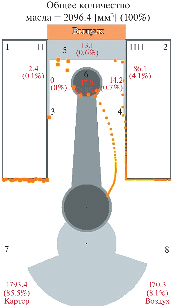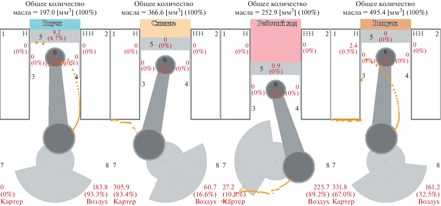 Scientific substantiation of the design and simulation techniques for one of the understudied aspects of oil supply, namely, jet supply of engine oil from the gaps of the rotating journal bearing to the “cylinder–piston” pairing of a high-speed four-stroke universal diesel engine, is given. The simulation resulted in visualization of the trajectory and zones of oil ingress on the friction surfaces of parts of the cylinder–piston group presented in this article, as well as a quantitative assessment of the oil volume in these zones and in the crankcase. The simulation technique and the results of its application can be of both scientific and practical interest for specialists in the field of lubrication design and reliability of piston machines.