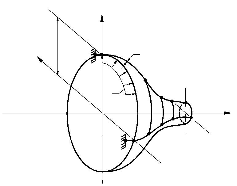 Входящие в (19) геометрические параметры имели следующие значения: a = 0.9 м; b = 0.4 м; c = 0.24 м. Осевая координата x изменялась в пределах 0 ≤ x ≤ 0.24π м. На левом торце оболочка первоначально имела шарнирное опирание, правый торец был свободен от закреплений. Вследствие наличия осевой симметрии оболочка моделировалась лентой элементов дискретизации, ориентированной вдоль меридиана оболочки (рис. 1).