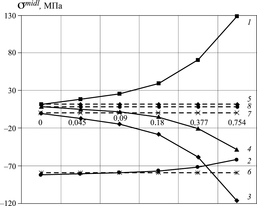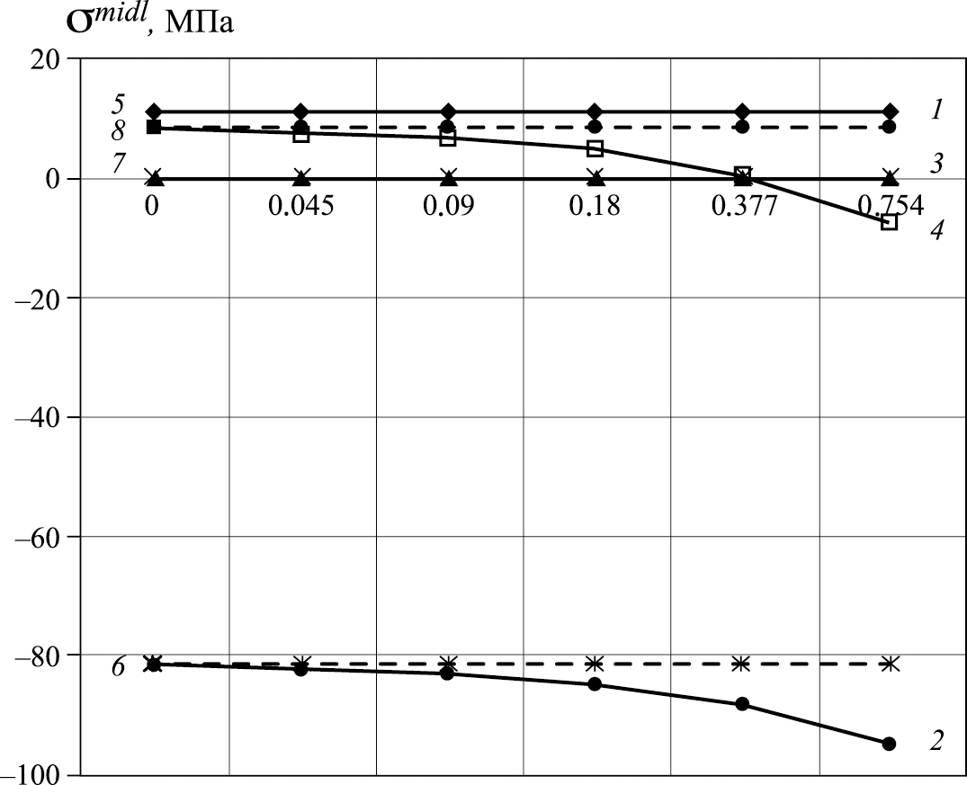 Рис. 3. Значения напряжений в формулировке смешанного метода с использованием скалярного (линии 1–4) и векторного (линии 5–8) способов интерполяции; линии 1, 3, 5, 7 – σss, линии 2, 4, 6, 8 – σθθ.