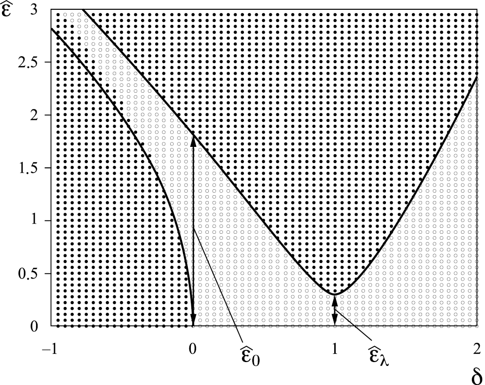 где – критическое значение величины ε, выше которого располагается зона неустойчивости уравнения (9) при δ = 0.