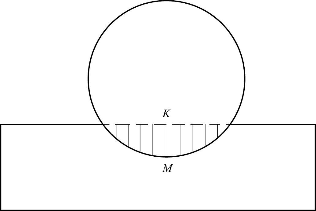 Рассмотрим измерения деформации образца эластомера СКУ-ПФЛ-100 в виде бруска прямоугольного сечения, на который давит цилиндрическое контртело (как при трении в геометрии цилиндр – плоскость) при статическом нагружении различными нагрузками. Размеры бруска: толщина 6 мм, ширина 8.15 мм, длина 50 мм. Образец закреплен справа и слева от пятна трения, сколь можно близко к нему. При каждой нагрузке проводилось измерение двух параметров: размера KМ (рис. 2) с точностью в 1.0 мкм и размера СD (рис. 2) с точностью 0.05 мм. Нагрузка задавалась ступенчато через 100 Н от нуля до 1000 Н с точностью приблизительно 4 Н. Площадь сегмента, являющегося частью площади эллипса (как косое сечение цилиндра), для простоты расчетов заменена площадью сегмента окружности с той же высотой и хордой. При этом учитывалось, что эта площадь является площадью боковой поверхности цилиндра.