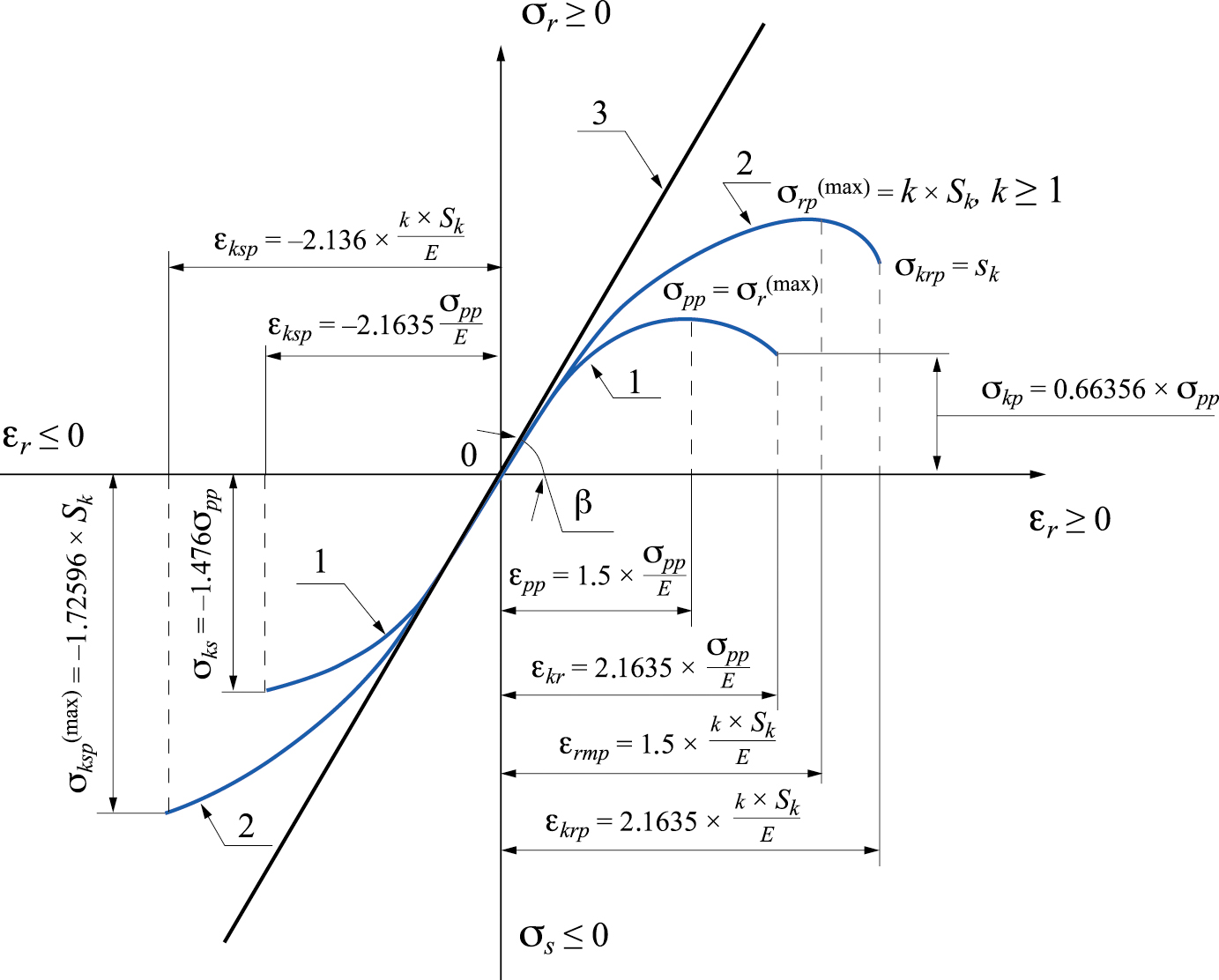 Руководствуясь предельной зависимостью (1), дополненной индексом “р”, после замены деформации в соответствии с (6) находим ординату [9, 10], адекватную максимальному значению , согласно требованию (7) (рис. 2, 3, кривая 2):