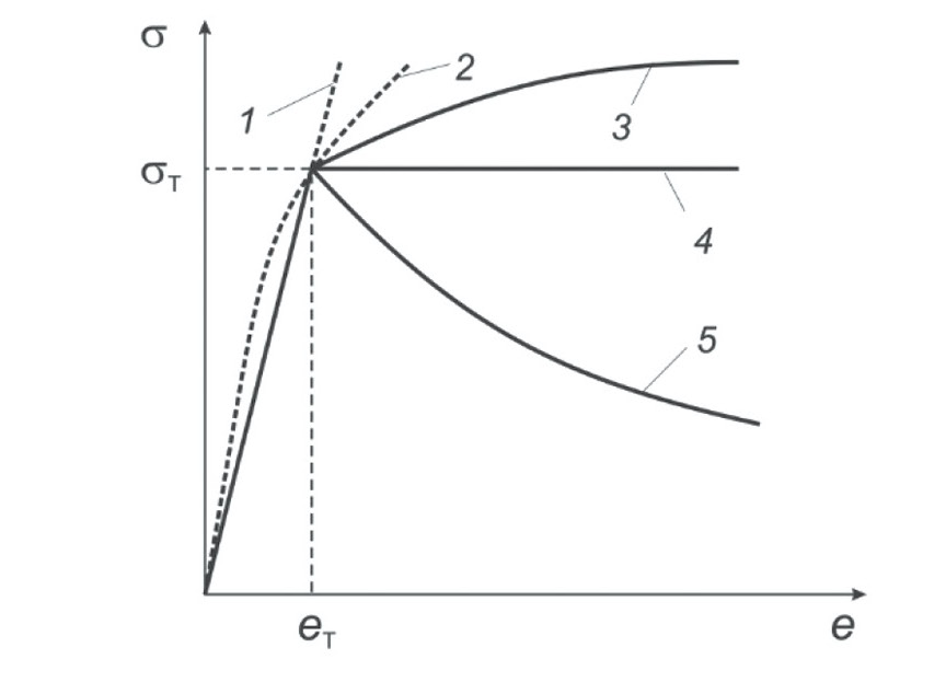 3. Fig. 2. Types of deformation diagrams of materials with different degrees of hardening and de-hardening: 1 - elastic deformation; 2 - deformation according to the power law from the initial state; 3 - elastic and inelastic deformation with hardening according to the power law; 4 - ideal elastic-plastic deformation; 5 - elastic and inelastic deformation with de-hardening according to the power law