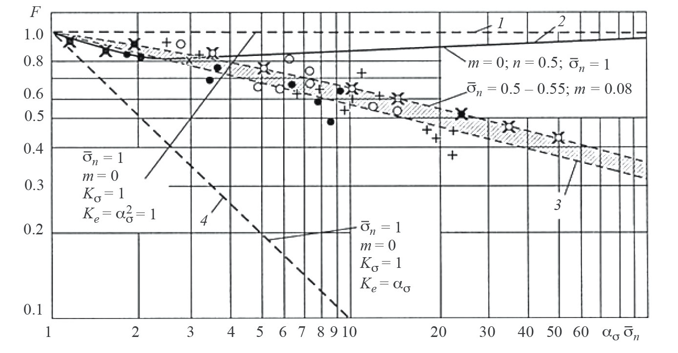 Рис. 3. Зависимости функционала F от номинальных напряжений, концентрации напряжений и показателя упрочнения материала: точки из эксперимента, линии – расчет; 1 – расчет по выражению (5), 2 – расчет по выражению (8), 3 – эксперимент и расчет по выражению (8), 4 – расчет по выражению (9)