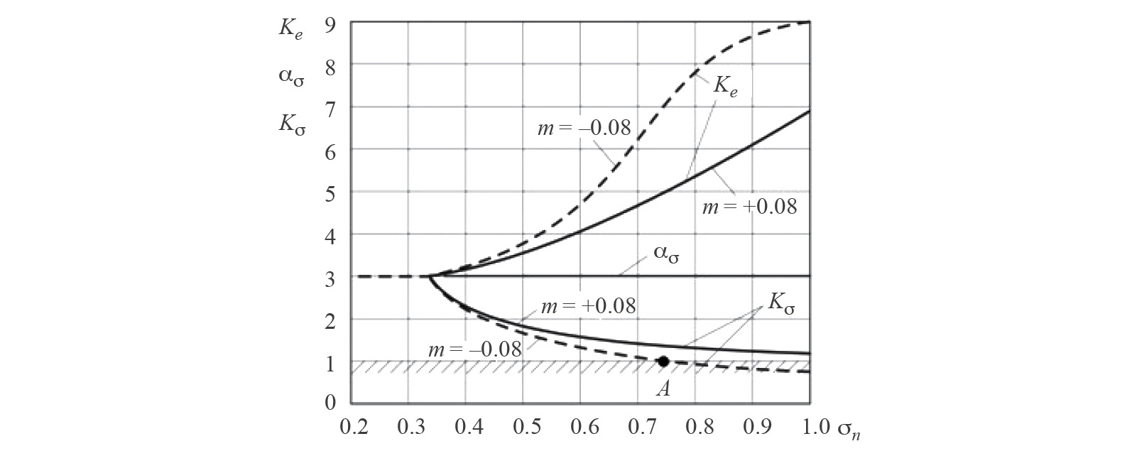 Для упрочняющихся (m = +0.08) и разупрочняющихся (m = –0.08) материалов при σ¯n > 0.33 коэффициенты концентрации деформаций Ke по выражениям (5) и (8) увеличиваются (Ke ασ), а коэффициенты концентрации напряжений Kσ снижаются (Kσ  ασ). Однако для разупрочняющегося сплава (m = –0.08) при увеличении σ¯n рост Ke оказывается существенно бóльшим (до 1.5 раз), чем для упрочняющейся стали (m = +0.08). Согласно деформационному критерию прочности [1, 7–9] это указывает на повышение опасности достижения предельных состояний в зоне концентрации деформаций при применении разупрочняющихся материалов (m ≤ 0).