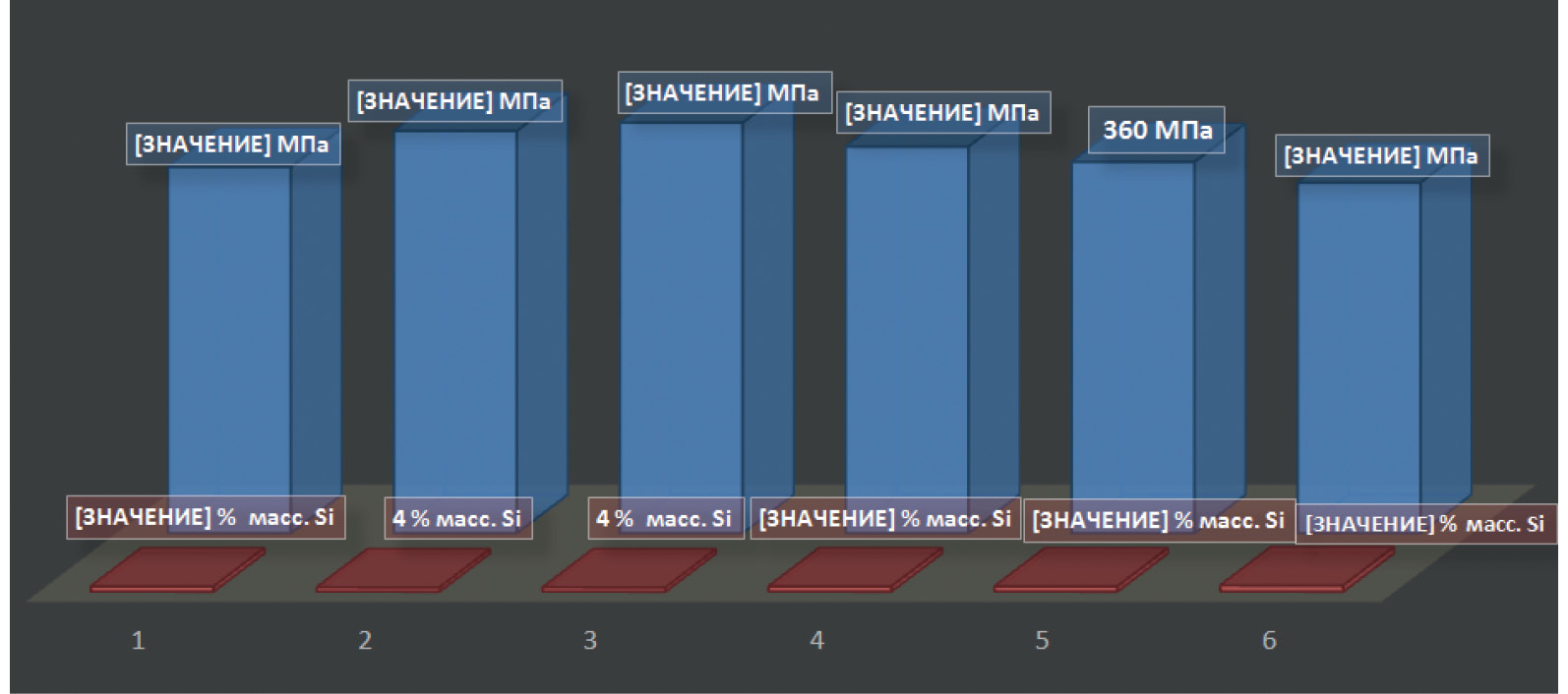 Расчетным способом можно определить, что при введении 15 мас. % технического углерода кажущаяся плотность составляет 2.38 г/см3. Соответственно, для полной реакции взаимодействия углерода с жидким кремнием пористость прессованной заготовки прогнозируемо должна составлять 26%. Однако в реальных условиях плотность прессовок составов № 1–6 (табл. 1) при давлении 100 МПа достигает значений 2.18–2.22 г/см3, что соответствует пористости порядка 30–32%. Предположим, что в избыточном поровом пространстве сохраняется наличие свободного кремния (не связанного с углеродом во вторичный карбид кремния) после проведения реакционного спекания. Расчетный анализ показывает, что для исследуемой выборки прессованных заготовок с учетом заполнения остаточных пор кремнием наблюдается корреляция с физико-механическими свойствами спеченного керамического материала (рис. 1). При этом чем больше кремния в керамике, тем ниже ее прочность [18–20].