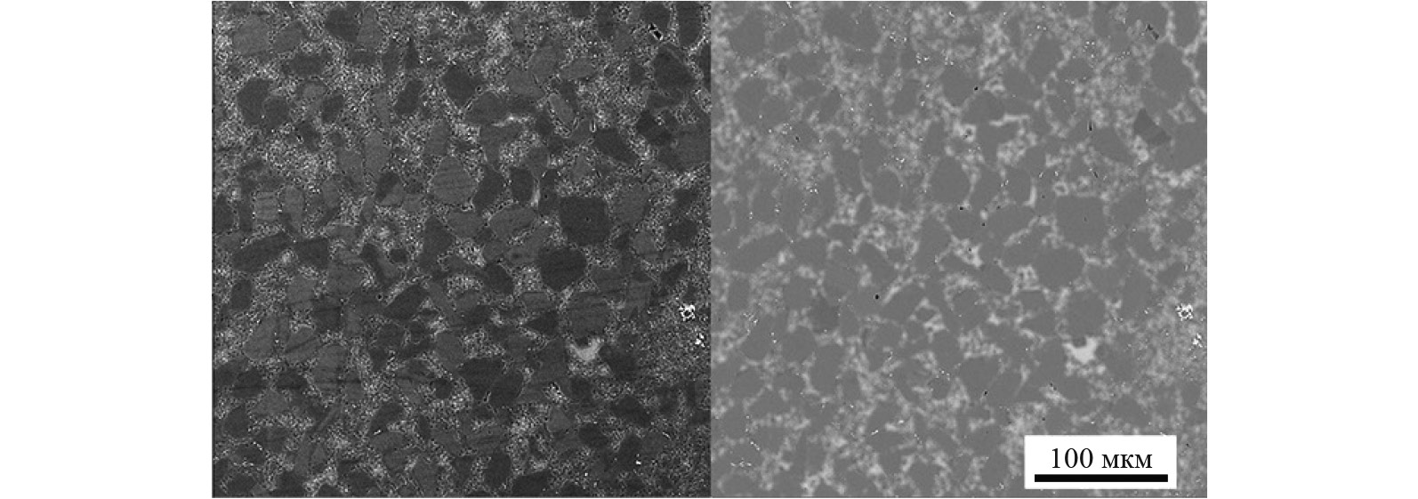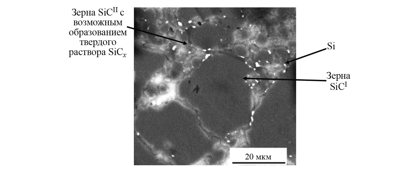 Керамический материал после спекания можно рассматривать как каркас, состоящий из зерен SiCI, скрепленный за счет реакционно-диффузионного механизма «связующим наполнителем» – зернами SiCII [21–23].