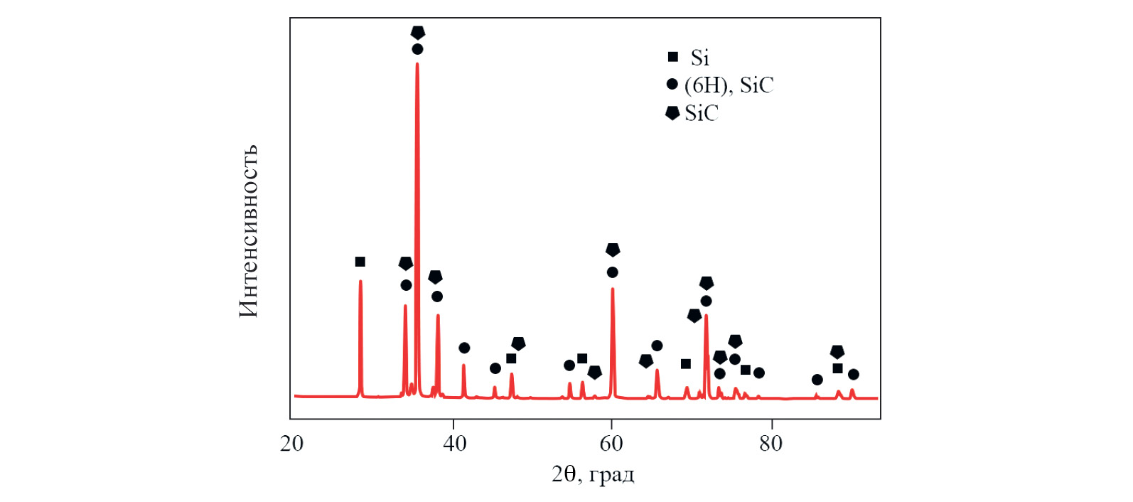 В процессе реакционного спекания заранее введенный в заготовки углерод взаимодействует с жидким кремнием с образованием вторичного карбида кремния, а оставшийся непрореагировавший кремний заполняет поры заготовки [5–7]. При этом имеющийся в конечном изделии несвязанный кремний и/или углерод негативно влияет на физико-механические свойства спеченного карбида кремния [8–10]. Таким образом, для получения материалов с максимальными физико-механическими характеристиками необходимо более точно подбирать количество вводимых в заготовку углерода и кремния для наибольшего заполнения пор вторичным карбидом кремния и минимизации количества остаточного кремния и/или углерода.