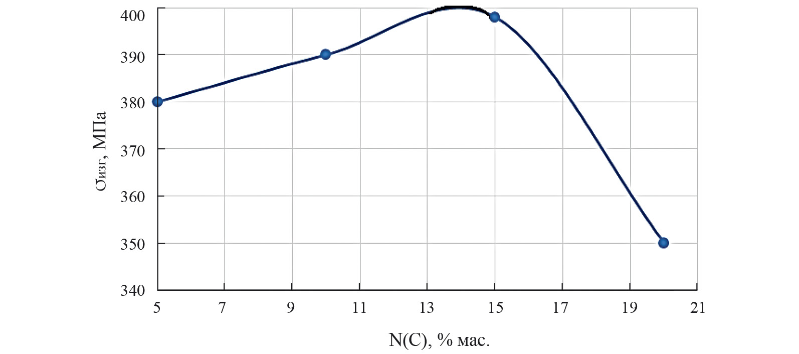 На рис. 5 показано изменение предела прочности при изгибе керамики от исходного содержания углерода.